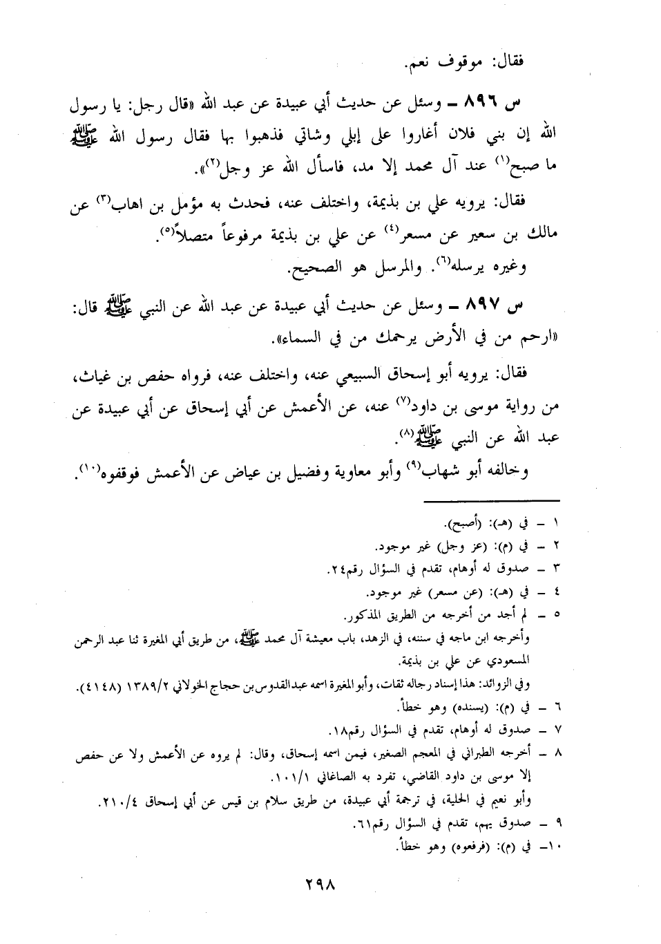 897- وَسُئِلَ عَنْ حَدِيثِ أَبِي عُبَيْدَةَ، عَنْ عَبْدِ اللَّهِ، عَنِ النَّبِيِّ صَلَّى اللَّهُ عَلَيْهِ وَسَلَّمَ، قَالَ: ارْحَمْ مَنْ فِي الْأَرْضِ يَرْحَمُكَ مَنْ فِي السَّمَاءِ.