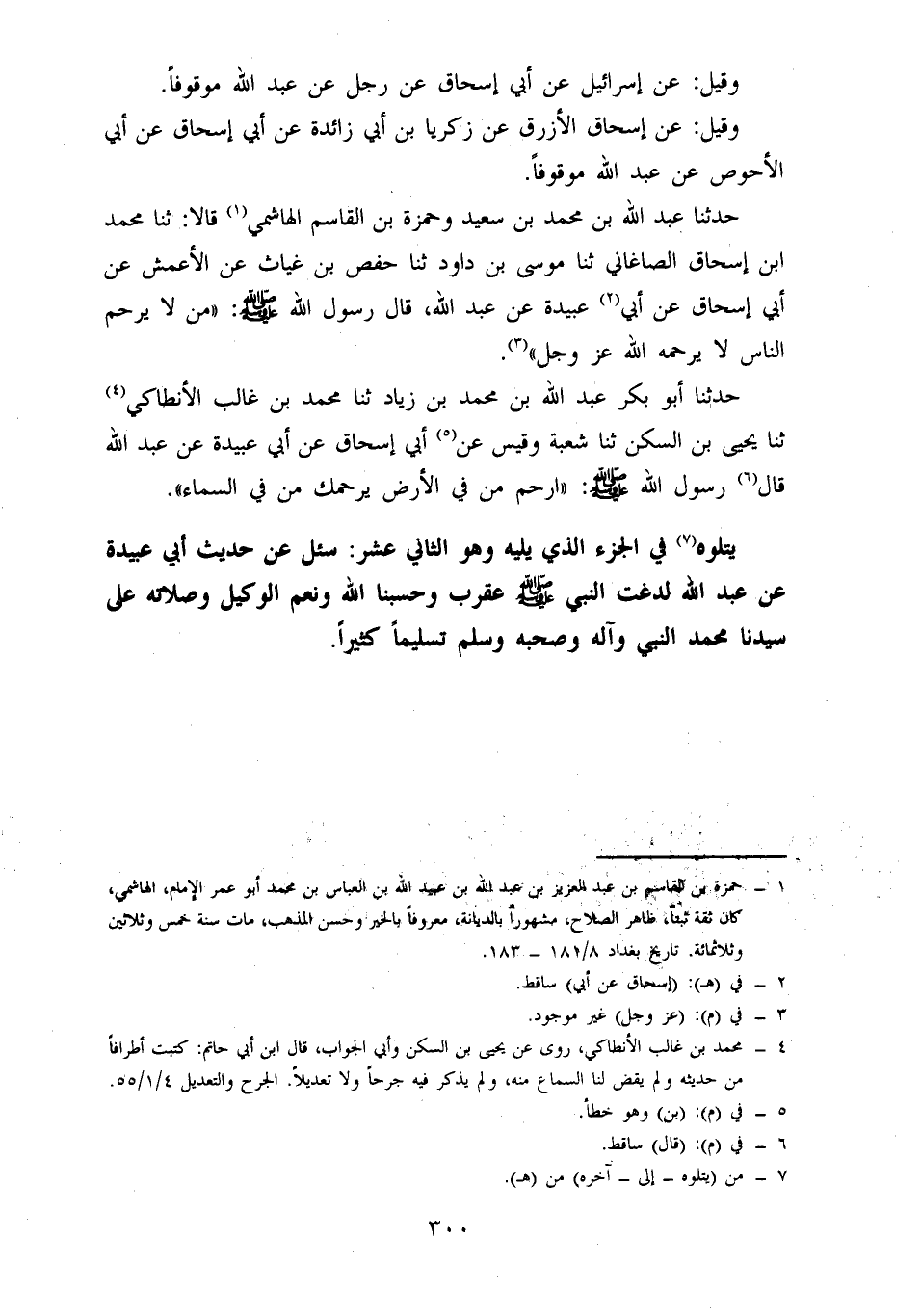 حَدَّثَنَا عَبْدُ اللَّهِ بْنُ مُحَمَّدِ بْنِ سَعِيدٍ، وحمزة بن القاسم الهاشمي، قالا: حدثنا محمد بن إسحاق الصاغاني، حدثنا موسى بن داود، حدثنا حَفْصِ بْنِ غِيَاثٍ، عَنِ الْأَعْمَشِ، عَنْ أَبِي إسحاق، عن أبي عبيدة، عن عبد الله، قال رسول الله صلى الله عليه وسلم: مَنْ لَا يَرْحَمُ النَّاسَ لَا يَرْحَمْهُ اللَّهُ عَزَّ وَجَلَّ.