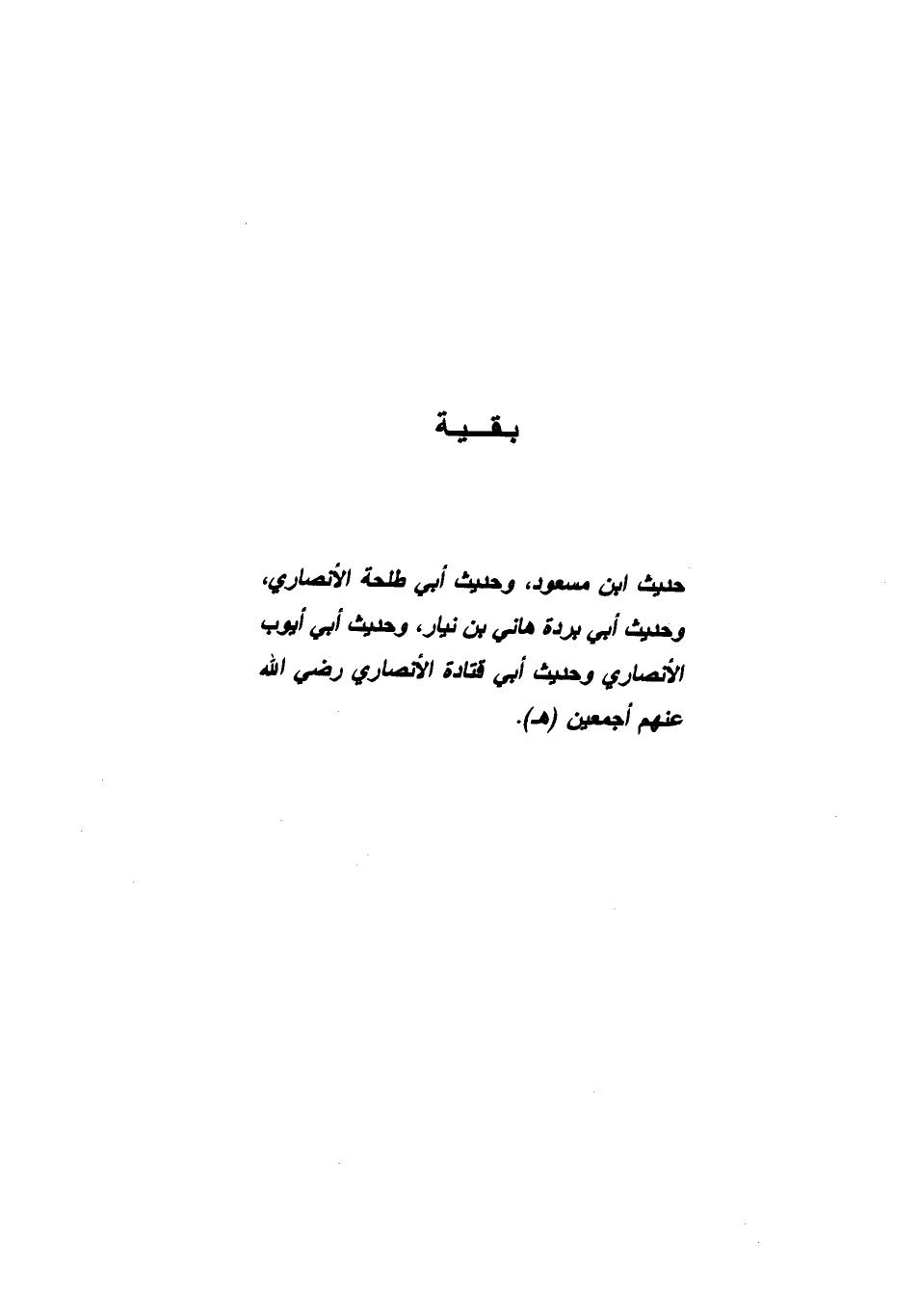 - بَقِيَّةُ حَدِيثِ ابْنِ مَسْعُودٍ وَحَدِيثِ أَبِي طَلْحَةَ الْأَنْصَارِيِّ وَحَدِيثِ أَبِي بُرْدَةَ هَانِي بْنِ نِيَارٍ وَحَدِيثِ أَبِي أَيُّوبَ الْأَنْصَارِيِّ وَحَدِيثِ أَبِي قَتَادَةَ الأنصاري، رَضِيَ اللَّهُ عَنْهُمْ أَجْمَعِينَ