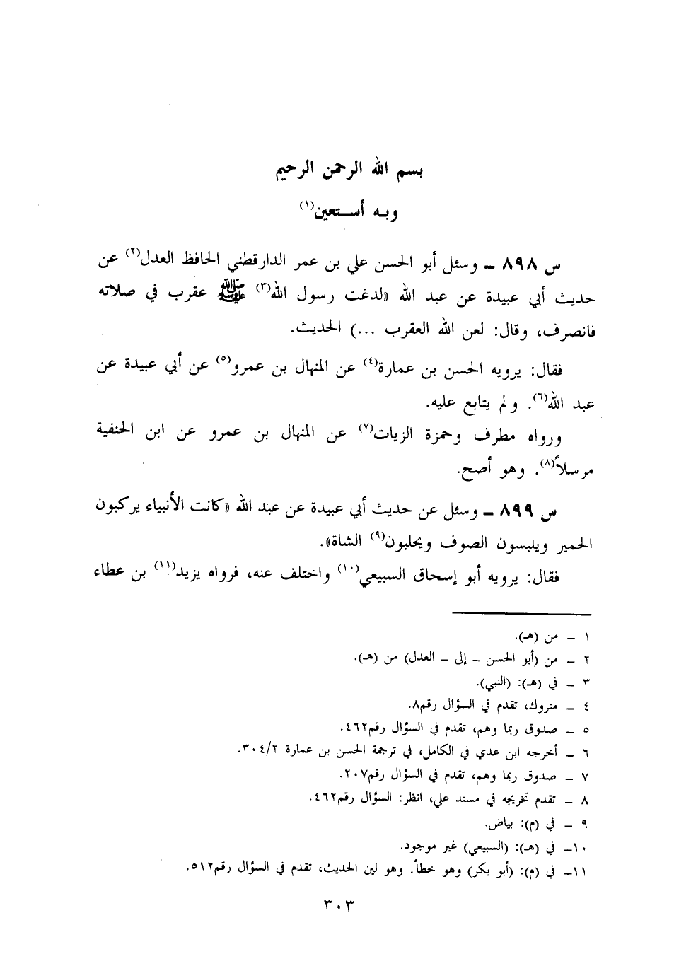 898- وَسُئِلَ أَبُو الْحَسَنِ عَلِيُّ بْنُ عُمَرَ الدَّارَقُطْنِيُّ الْحَافِظُ الْعَدْلُ، عَنْ حَدِيثِ أَبِي عُبَيْدَةَ، عَنْ عَبْدِ اللَّهِ لَدَغَتْ رَسُولَ اللَّهِ صَلَّى اللَّهُ عَلَيْهِ وَسَلَّمَ عَقْرَبٌ فِي صَلَاتِهِ فَانْصَرَفَ، وَقَالَ: لَعَنَ اللَّهُ الْعَقْرَبَ، ... الْحَدِيثَ.