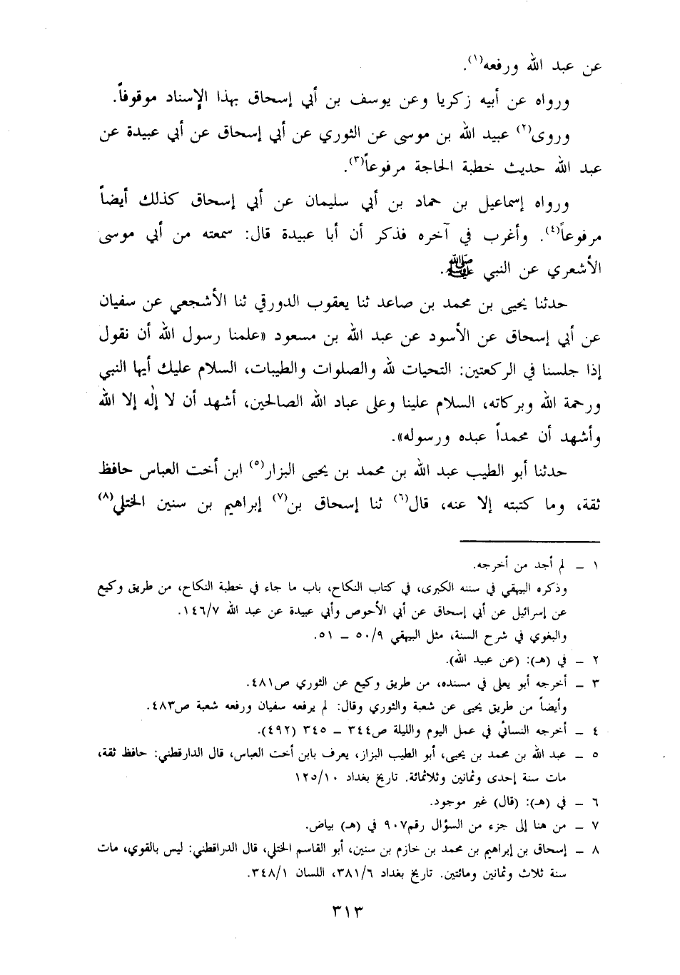 حَدَّثَنَا يَحْيَى بْنُ مُحَمَّدِ بْنِ صَاعِدٍ، حدثنا يعقوب الدورقي، حدثنا الأشجعي، عن سفيان، عن أبي إسحاق، عن الْأَسْوَدِ، عَنْ عَبْدِ اللَّهِ بْنِ مَسْعُودٍ عَلَّمْنَا رسول الله صلى الله عليه وسلم إن نَقُولَ إِذَا جَلَسْنَا فِي الرَّكْعَتَيْنِ: التَّحِيَّاتُ لِلَّهِ وَالصَّلَوَاتُ وَالطَّيِّبَاتُ السَّلَامُ عَلَيْكَ أَيُّهَا النَّبِيُّ وَرَحْمَةُ اللَّهِ وَبَرَكَاتُهُ السَّلَامُ عَلَيْنَا وَعَلَى عِبَادِ اللَّهِ الصَّالِحِينَ أَشْهَدُ أَنْ لَا إِلَهَ إِلَّا اللَّهُ وَأَشْهَدُ أَنَّ مُحَمَّدًا عَبْدُهُ وَرَسُولُهُ.