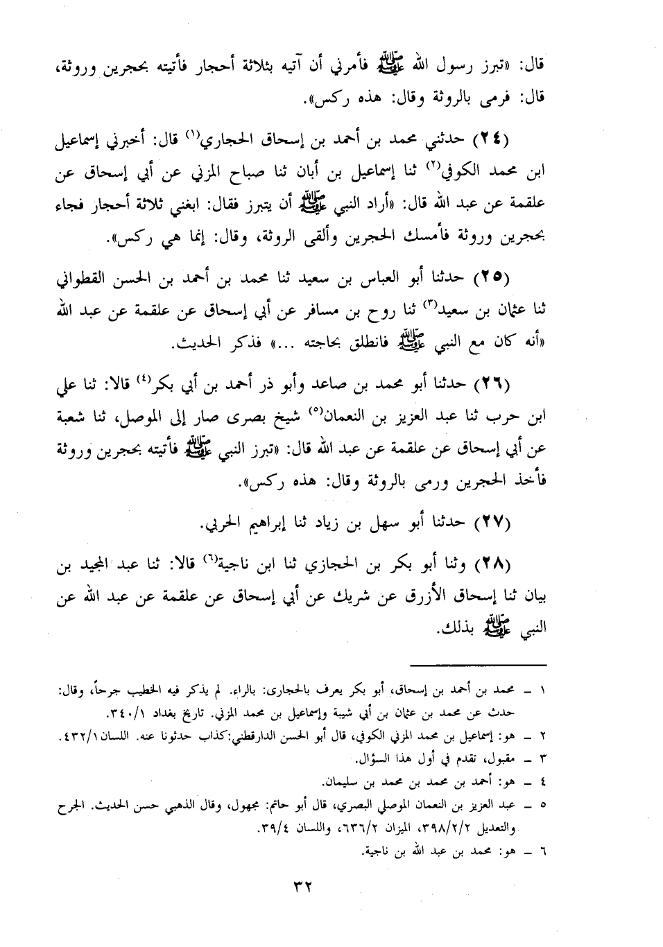 (24) حَدَّثَنِي مُحَمَّدُ بْنُ أَحْمَدَ بْنِ إِسْحَاقَ الْحِجَارِيُّ، قال: أخبرني إسماعيل بن محمد الكوفي، حدثنا إسماعيل بن أبان، حدثنا صَبَّاحٌ الْمُزَنِّيُّ، عَنْ أَبِي إِسْحَاقَ، عَنْ عَلْقَمَةَ، عَنْ عَبْدِ اللَّهِ، قَالَ: أَرَادَ النَّبِيُّ صَلَّى اللَّهُ عَلَيْهِ وَسَلَّمَ أَنْ يَتَبَرَّزَ، فَقَالَ: ابْغِنِي ثَلَاثَةَ أَحْجَارٍ، فَجَاءَ بِحَجَرَيْنِ وَرَوْثَةٍ، فَأَمْسَكَ الْحَجَرَيْنِ، وَأَلْقَى الرَّوْثَةَ، وَقَالَ: إِنَّمَا هِيَ رِكْسٌ.