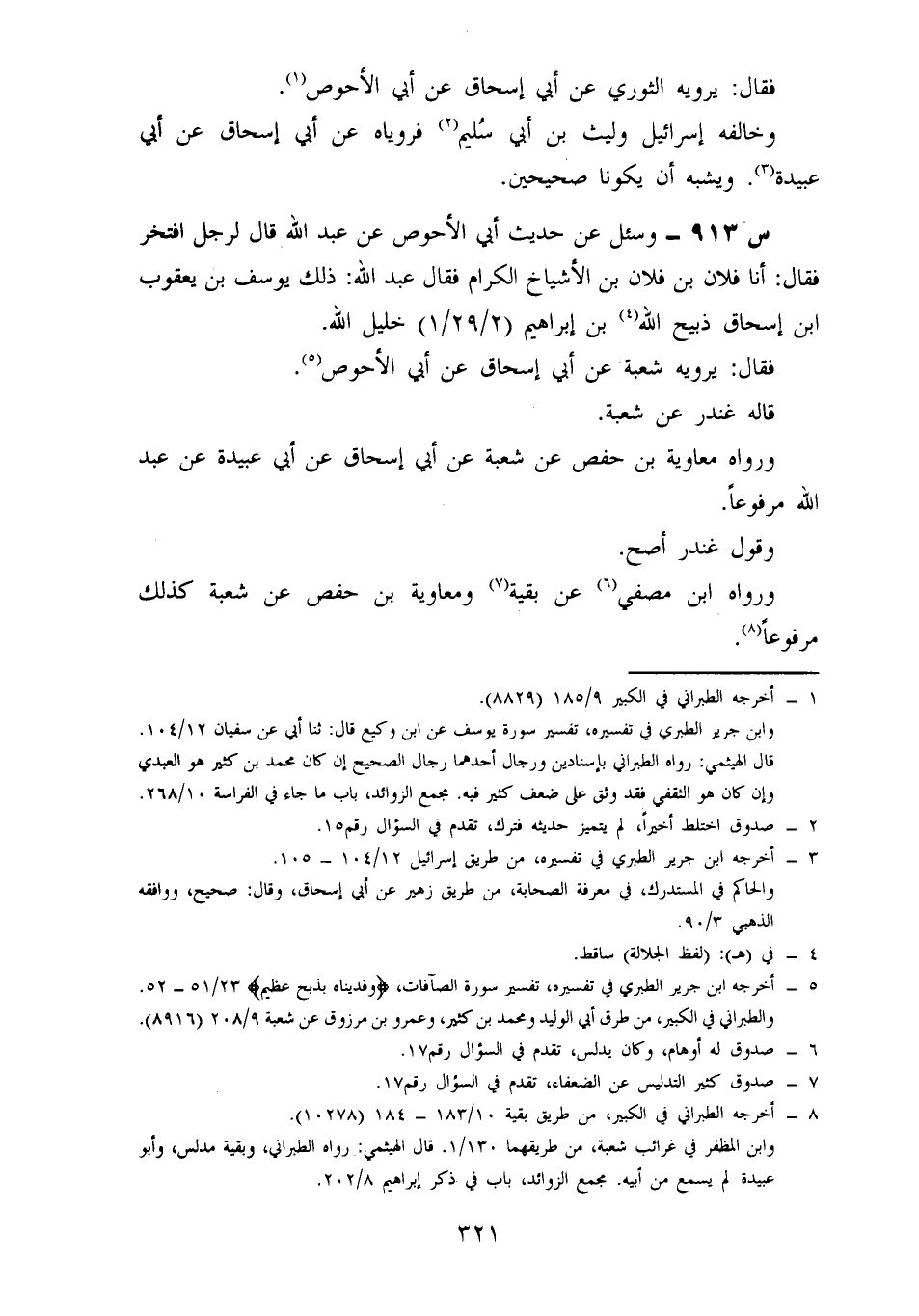 913- وسئل عن حديث أبي الأحوص، عن عبد اللَّهِ، قَالَ لِرَجُلٍ افْتَخَرَ فَقَالَ أَنَا فُلَانُ بْنُ فُلَانِ بْنِ الْأَشْيَاخِ الْكِرَامِ فَقَالَ عَبْدُ اللَّهِ ذَلِكَ يُوسُفُ بْنُ يَعْقُوبَ بْنِ إِسْحَاقَ ذَبِيحِ اللَّهِ بْنِ إِبْرَاهِيمَ خَلِيلِ اللَّهِ.