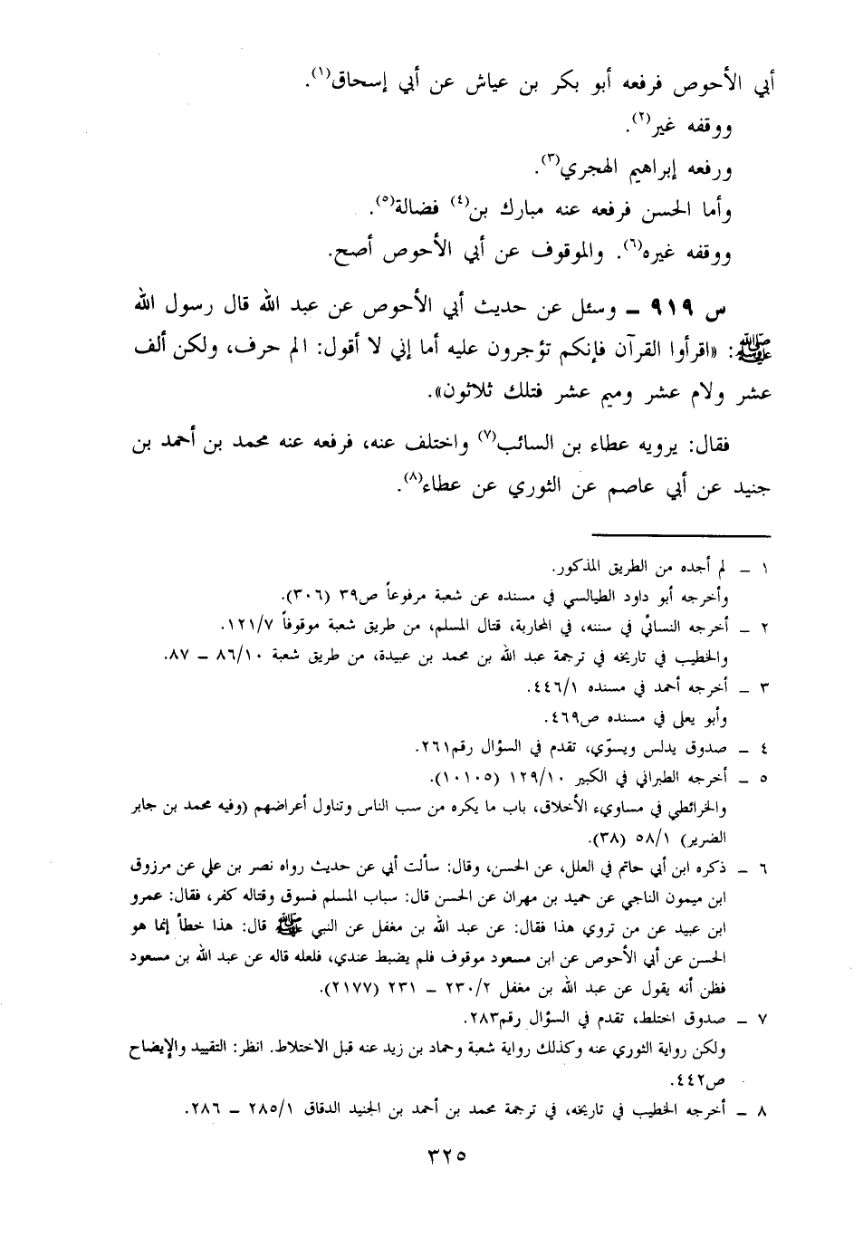 919- وسئل عن حديث أبي الأحوص، عن عبد اللَّهِ، قَالَ رَسُولُ اللَّهِ صَلَّى اللَّهُ عَلَيْهِ وسلم: اقرؤوا القرآن فإنكم تؤجرون عليه أما إني لا أقول: الم حَرْفٌ، وَلَكِنْ أَلِفٌ عَشْرَ وَلَامٌ عَشْرَ وَمِيمٌ عَشْرَ فَتِلْكَ ثَلَاثُونَ.