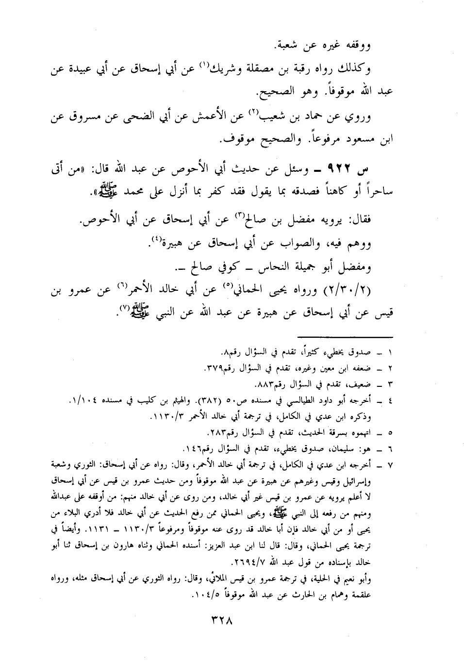 922- وسئل عن حديث أبي الأحوص، عن عبد اللَّهِ، قَالَ: مَنْ أَتَى سَاحِرًا أَوْ كَاهِنًا فَصَدَّقَهُ بِمَا يَقُولُ فَقَدْ كَفَرَ بِمَا أُنْزِلَ عَلَى مُحَمَّدٍ صَلَّى اللَّهُ عَلَيْهِ وَسَلَّمَ.