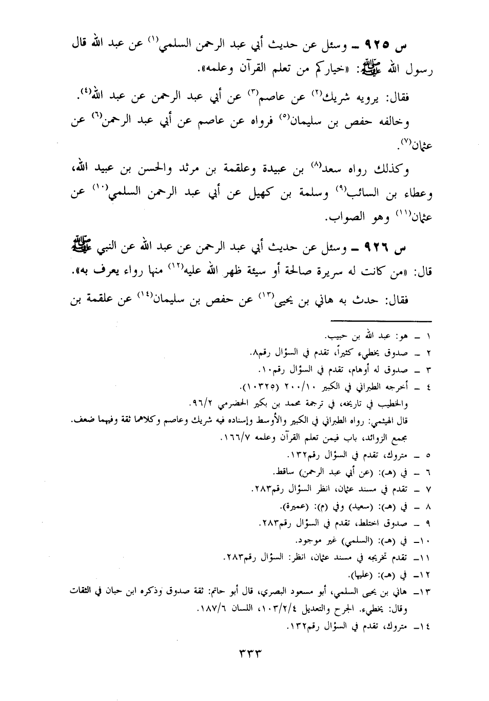 925- وسئل عن حديث أبي عبد الرحمن السلمي، عَنْ عَبْدِ اللَّهِ، قَالَ رَسُولُ اللَّهِ صَلَّى اللَّهُ عَلَيْهِ وَسَلَّمَ: خِيَارُكُمْ مَنْ تَعَلَّمَ الْقُرْآنَ وَعَلَّمَهُ.