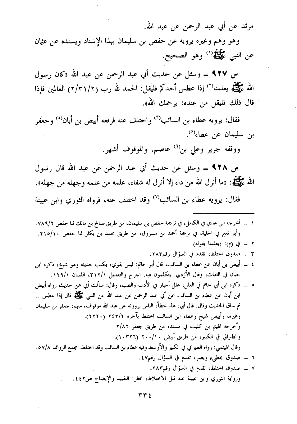 927- وسئل عن حديث أبي عبد الرحمن، عن عَبْدِ اللَّهِ؛ كَانَ رَسُولُ اللَّهِ صَلَّى اللَّهُ عَلَيْهِ وَسَلَّمَ يُعَلِّمُنَا إِذَا عَطَسَ أَحَدُكُمْ، فَلْيَقُلْ: الْحَمْدُ لِلَّهِ رَبِّ الْعَالَمِينَ، فَإِذَا قَالَ ذَلِكَ، فَلْيَقُلْ مِنْ عِنْدِهِ: يَرْحَمُكَ اللَّهُ.