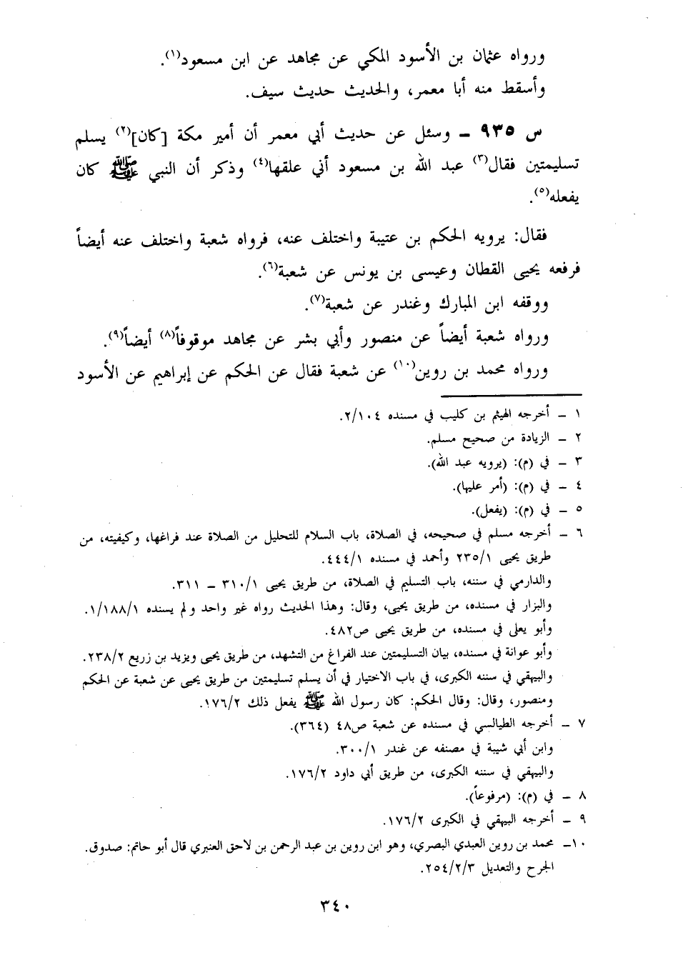 935- وَسُئِلَ عَنْ حَدِيثِ أَبِي مَعْمَرٍ أَنَّ أَمِيرَ مَكَّةَ كَانَ يُسَلِّمُ تَسْلِيمَتَيْنِ، فَقَالَ عَبْدُ اللَّهِ بْنُ مَسْعُودٍ: أَنَّى عَلِقَهَا وَذَكَرَ أَنَّ النَّبِيَّ صَلَّى اللَّهُ عَلَيْهِ وَسَلَّمَ كَانَ يَفْعَلُهُ.