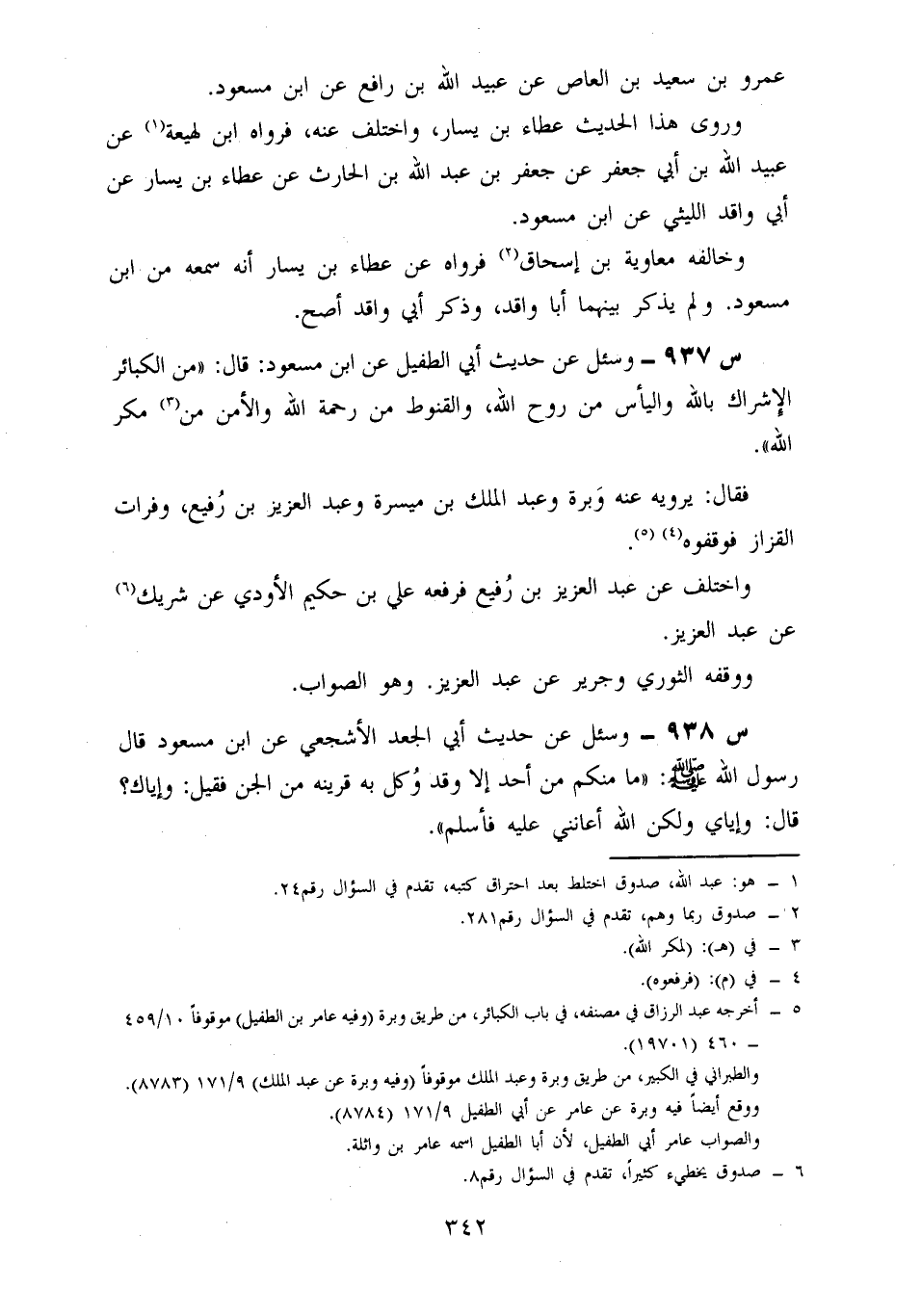 937- وَسُئِلَ عَنْ حَدِيثِ أَبِي الطُّفَيْلِ، عَنِ ابْنِ مَسْعُودٍ قَالَ مِنَ الْكَبَائِرِ الْإِشْرَاكُ بِاللَّهِ وَالْيَأْسُ مِنْ رَوْحِ اللَّهِ وَالْقُنُوطُ مِنْ رَحْمَةِ اللَّهِ وَالْأَمْنُ مِنْ مَكْرِ اللَّهِ.