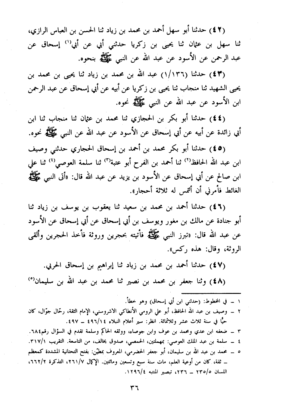 (42) حَدَّثَنَا أَبُو سَهْلٍ أَحْمَدُ بْنُ مُحَمَّدِ بْنِ زياد، حدثنا الحسن بن العباس الرازي، حدثنا سهل بن عثمان، حدثنا يَحْيَى بْنُ زَكَرِيَّا، حَدَّثَنِي أَبِي، عَنْ أَبِي إِسْحَاقَ، عَنْ عَبْدِ الرَّحْمَنِ، عَنِ الْأَسْوَدِ، عَنْ عَبْدِ اللَّهِ، عَنِ النَّبِيِّ صَلَّى اللَّهُ عَلَيْهِ وَسَلَّمَ، بِنَحْوِهِ.