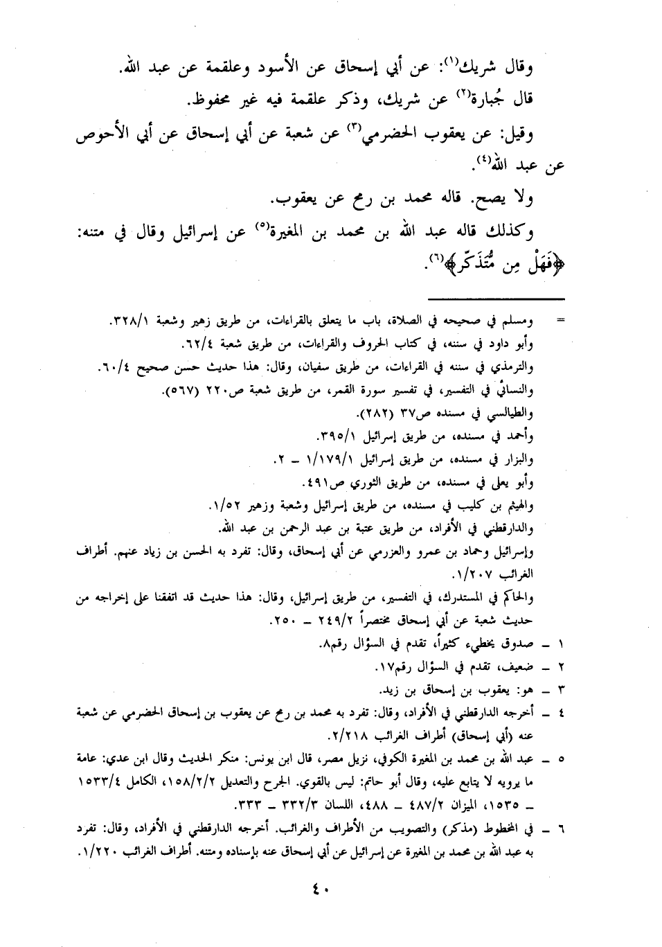 وَكَذَلِكَ قَالَهُ عَبْدُ اللَّهِ بْنُ مُحَمَّدِ بْنِ الْمُغِيرَةِ، عَنْ إِسْرَائِيلَ، وَقَالَ فِي مَتْنِهِ: {فَهَلْ مِنْ مُتَذَكِّرٍ} .