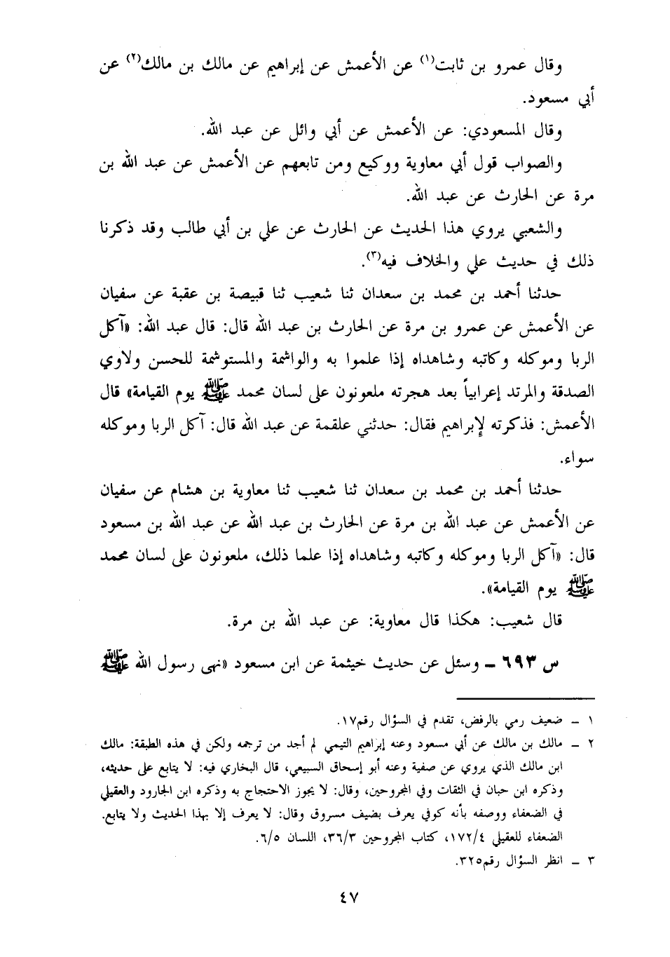 حدثنا أحمد بن محمد بن سعدان، حدثنا شعيب، حدثنا قَبِيصَةُ بْنُ عُقْبَةَ، عَنْ سُفْيَانَ، عَنِ الْأَعْمَشِ، عَنْ عَمْرِو بْنِ مُرَّةَ، عَنِ الْحَارِثِ بْنِ عَبْدِ اللَّهِ، قَالَ: قَالَ عَبْدُ اللَّهِ: آكِلُ الرِّبَا وَمُوكِلُهُ وَكَاتِبُهُ وَشَاهِدَاهُ إِذَا عَلِمُوا بِهِ وَالْوَاشِمَةُ وَالْمُسْتَوْشِمَةُ لِلْحُسْنِ وَلَاوِي الصَّدَقَةِ وَالْمُرْتَدُّ إِعْرَابِيًّا بَعْدَ هِجْرَتِهِ مَلْعُونُونَ عَلَى لِسَانِ مُحَمَّدٍ صَلَّى اللَّهُ عَلَيْهِ وَسَلَّمَ يَوْمَ الْقِيَامَةِ قَالَ الْأَعْمَشُ: فَذَكَرْتُهُ لِإِبْرَاهِيمَ، فَقَالَ: حَدَّثَنِي عَلْقَمَةُ، عَنْ عَبْدِ اللَّهِ، قَالَ: آكِلُ الرِّبَا وَمُوكِلُهُ سَوَاءٌ.