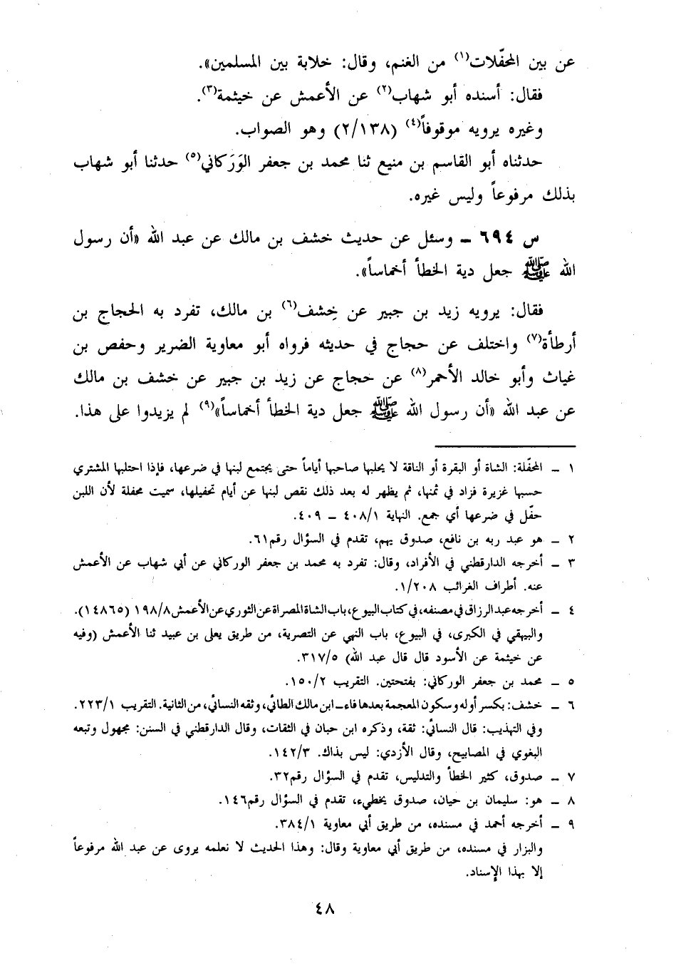 694- وَسُئِلَ عَنْ حَدِيثِ خِشْفِ بْنِ مَالِكٍ، عَنْ عَبْدِ اللَّهِ أَنَّ رَسُولَ اللَّهِ صَلَّى اللَّهُ عَلَيْهِ وَسَلَّمَ جَعَلَ دِيَةَ الْخَطَأِ أَخْمَاسًا.