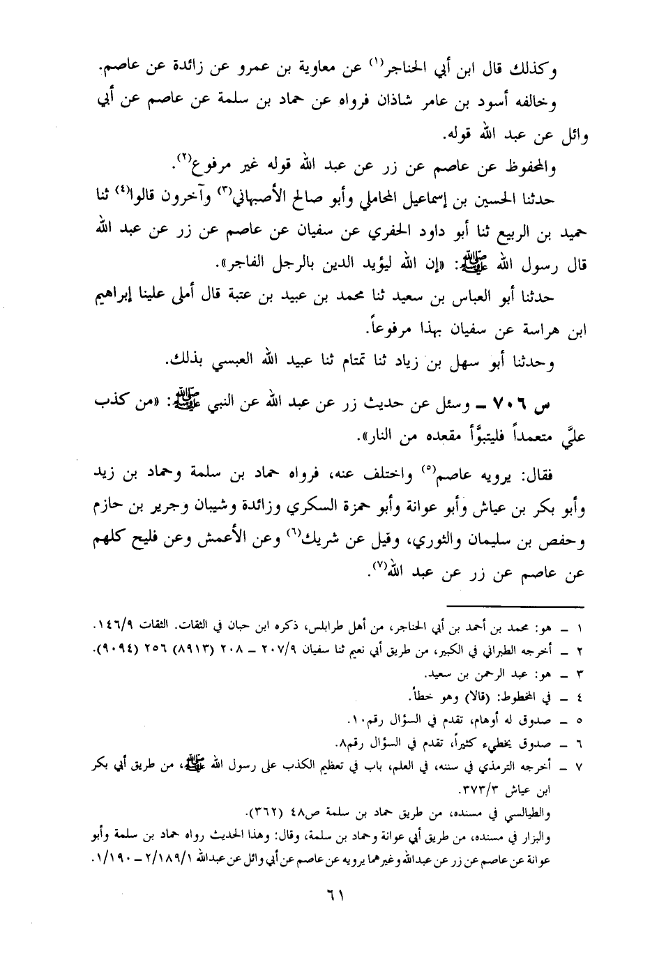 706- وَسُئِلَ عَنْ حَدِيثِ زِرٍّ، عَنْ عَبْدِ اللَّهِ، عَنِ النَّبِيِّ صَلَّى اللَّهُ عليه وسلم: من كَذَبَ عَلَيَّ مُتَعَمِّدًا فَلْيَتَبَوَّأْ مَقْعَدَهُ مِنَ النَّارِ.