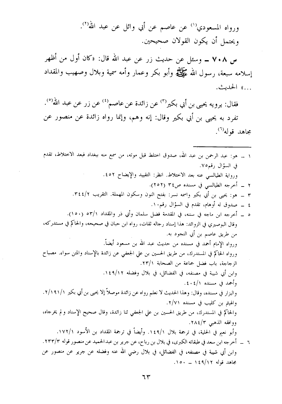 708- وَسُئِلَ عَنْ حَدِيثِ زِرٍّ، عَنْ عَبْدِ اللَّهِ، قَالَ: كَانَ أَوَّلَ مَنْ أَظْهَرَ إِسْلَامَهُ سَبْعَةٌ: رَسُولُ اللَّهِ صَلَّى اللَّهُ عَلَيْهِ وَسَلَّمَ، وَأَبُو بَكْرٍ، وَعَمَّارٌ، وَأُمُّهُ سُمَيَّةُ، وَبِلَالٌ، وَصُهَيْبٌ، وَالْمِقْدَادُ، ... الْحَدِيثَ.