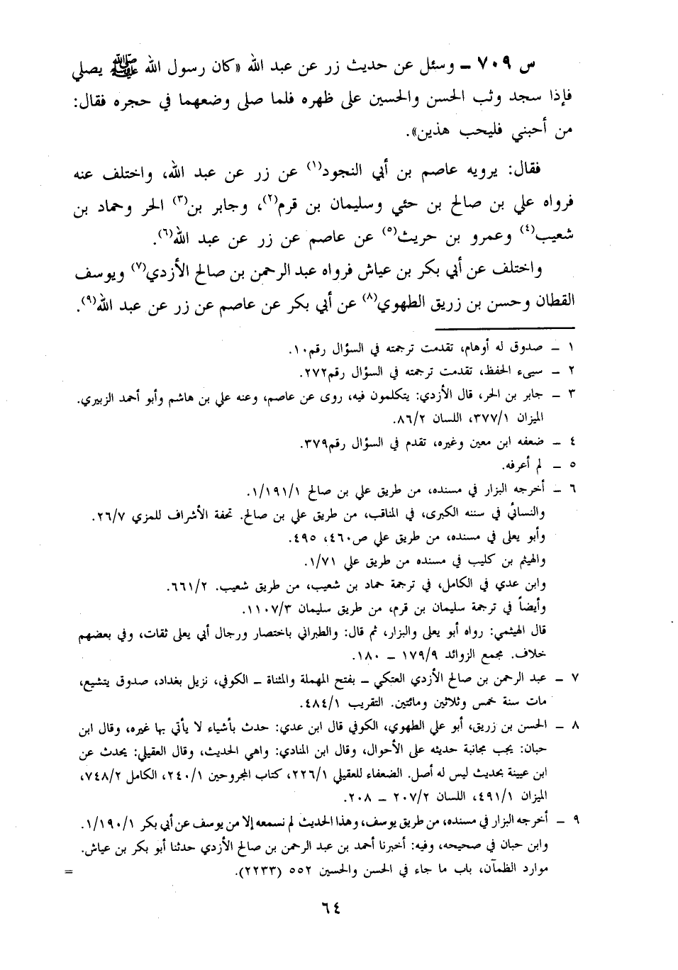 709- وَسُئِلَ عَنْ حَدِيثِ زِرٍّ، عَنْ عَبْدِ اللَّهِ؛ كَانَ رَسُولُ اللَّهِ صَلَّى اللَّهُ عَلَيْهِ وَسَلَّمَ يُصَلِّي، فَإِذَا سَجَدَ وَثَبَ الْحَسَنُ وَالْحُسَيْنُ عَلَى ظَهْرِهِ، فَلَمَّا صَلَّى وَضَعَهُمَا فِي حِجْرِهِ، فَقَالَ: مَنْ أَحَبَّنِي فَلْيُحِبَّ هَذَيْنِ.