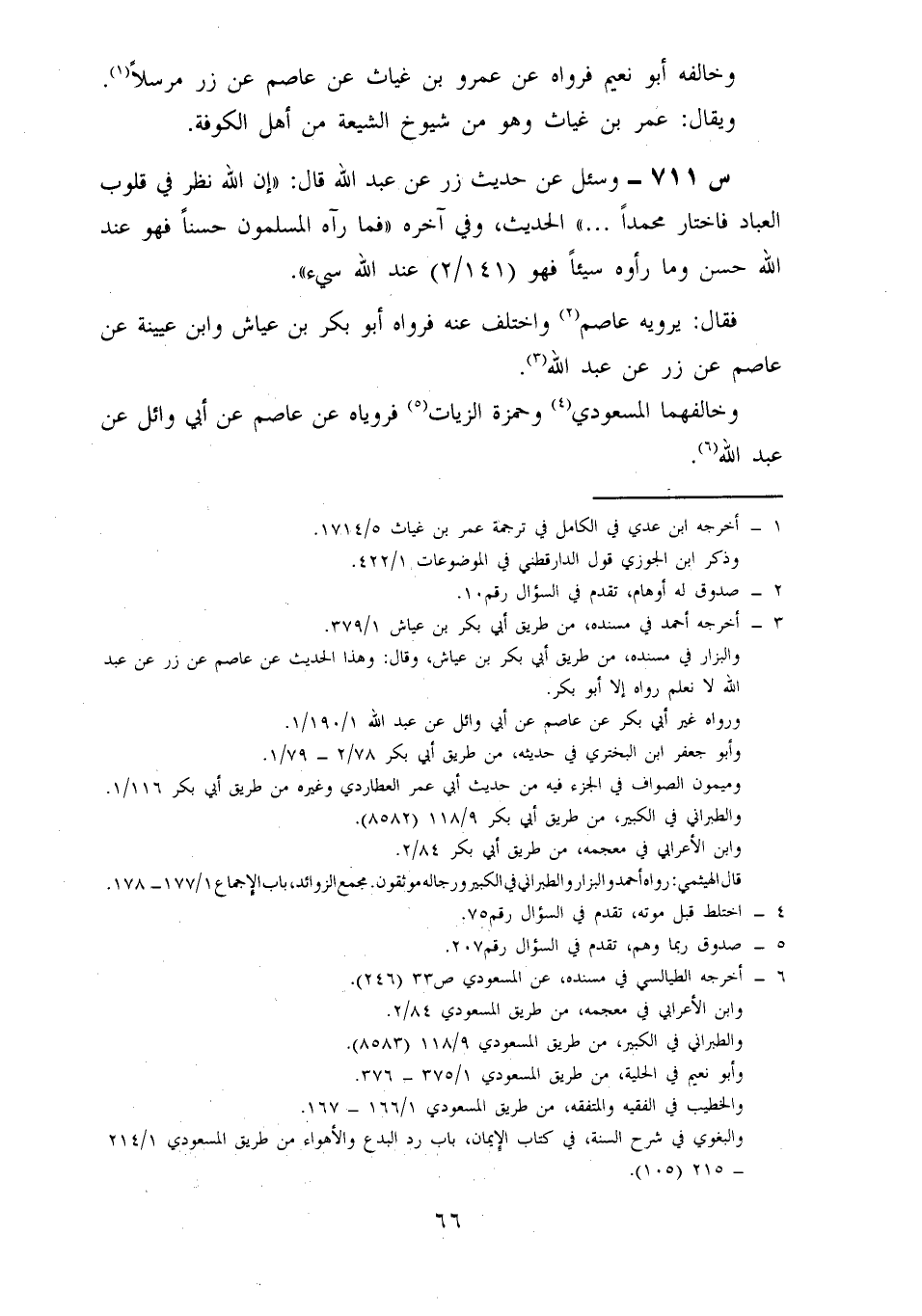 711- وَسُئِلَ عَنْ حَدِيثِ زِرٍّ، عَنْ عَبْدِ اللَّهِ، قَالَ: إِنَّ اللَّهَ نَظَرَ فِي قُلُوبِ الْعِبَادِ فَاخْتَارَ مُحَمَّدًا، الْحَدِيثَ، وَفِي آخْرِهِ فَمَا رَآهُ الْمُسْلِمُونُ حَسَنًا فَهُوَ عِنْدَ اللَّهِ حَسَنٌ، وَمَا رَأَوْهُ سَيِّئًا فَهُوَ عِنْدَ اللَّهِ سَيِّءٌ.
