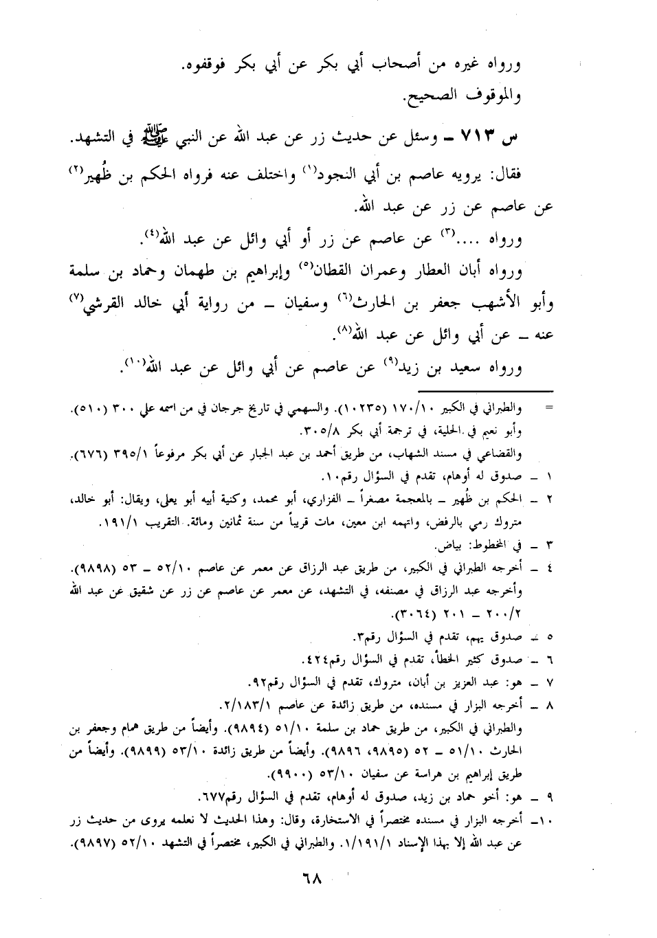 713- وَسُئِلَ عَنْ حَدِيثِ زِرٍّ، عَنْ عَبْدِ اللَّهِ، عَنِ النَّبِيِّ صَلَّى اللَّهُ عليه وسلم في التَّشَهُّدِ.