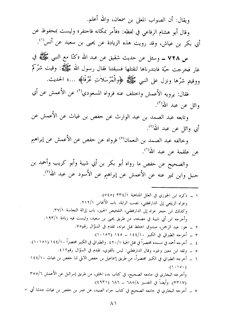 728- وسئل عن حديث شقيق، عن عبد الله كُنَّا مَعَ النَّبِيِّ صَلَّى اللَّهُ عَلَيْهِ وَسَلَّمَ فِي غَارٍ فَخَرَجَتْ حَيَّةٌ فَابْتَدَرْنَاهَا لِنَقْتُلَهَا فَسَبَقَتْنَا، فَقَالَ رَسُولُ اللَّهِ صَلَّى اللَّهُ عَلَيْهِ وَسَلَّمَ: وُقِيَتْ شَرَّكُمْ وَوُقِيتُمْ شَرَّهَا، وَنَزَلَ عَلَى النَّبِيِّ صَلَّى اللَّهُ عَلَيْهِ وَسَلَّمَ: {وَالْمُرْسَلاتِ عُرْفًا} ، ... الْحَدِيثَ.