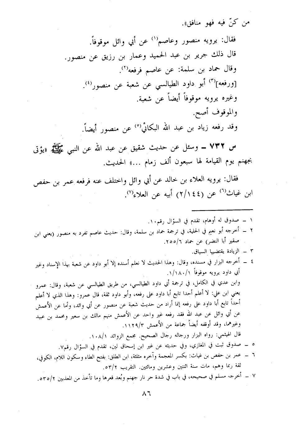 731- وسئل عن حديث شقيق، عَنْ عَبْدِ اللَّهِ، عَنِ النَّبِيِّ صَلَّى اللَّهُ عَلَيْهِ وَسَلَّمَ: ثَلَاثٌ مَنْ كُنَّ فِيهِ فَهُوَ مُنَافِقٌ.