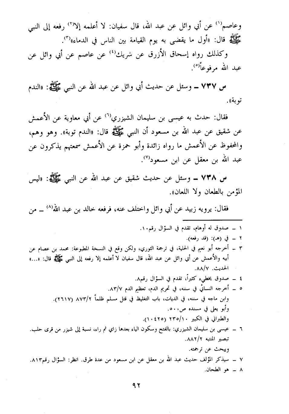 737- وَسُئِلَ عَنْ حَدِيثِ أَبِي وَائِلٍ، عَنْ عَبْدِ اللَّهِ، عَنِ النَّبِيِّ صَلَّى اللَّهُ عَلَيْهِ وَسَلَّمَ: النَّدَمُ تَوْبَةٌ.