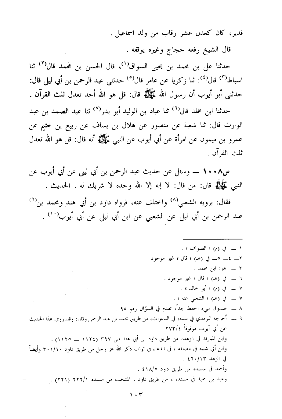 1008- وَسُئِلَ عَنْ حَدِيثِ عَبْدِ الرَّحْمَنِ بْنِ أَبِي لَيْلَى، عَنْ أَبِي أَيُّوبَ، عَنِ النَّبِيِّ صَلَّى اللَّهُ عَلَيْهِ وَسَلَّمَ، قَالَ: مَنْ قَالَ: لَا إِلَهَ إِلَّا اللَّهُ وَحْدَهُ لَا شَرِيكَ لَهُ ... الْحَدِيثَ.
