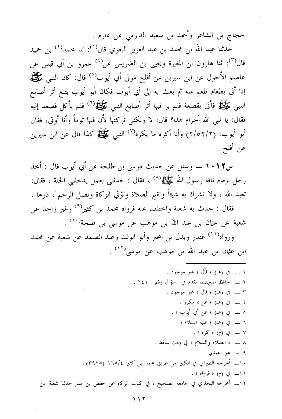 1012- وَسُئِلَ عَنْ حَدِيثِ مُوسَى بْنِ طَلْحَةَ، عَنْ أَبِي أَيُّوبَ، قَالَ: أَخَذَ رَجُلٌ بِزِمَامِ نَاقَةِ رَسُولِ اللَّهِ صَلَّى اللَّهُ عَلَيْهِ وَسَلَّمَ، فقال: حَدِّثْنِي بِعَمَلٍ يُدْخِلُنِي الْجَنَّةَ، فَقَالَ: تَعْبُدُ اللَّهَ، وَلَا تُشْرِكُ بِهِ شَيْئًا، وَتُقِيمُ الصَّلَاةَ، وَتُؤْتِي الزَّكَاةَ، وَتَصِلُ الرَّحِمَ، ذَرْهَا.