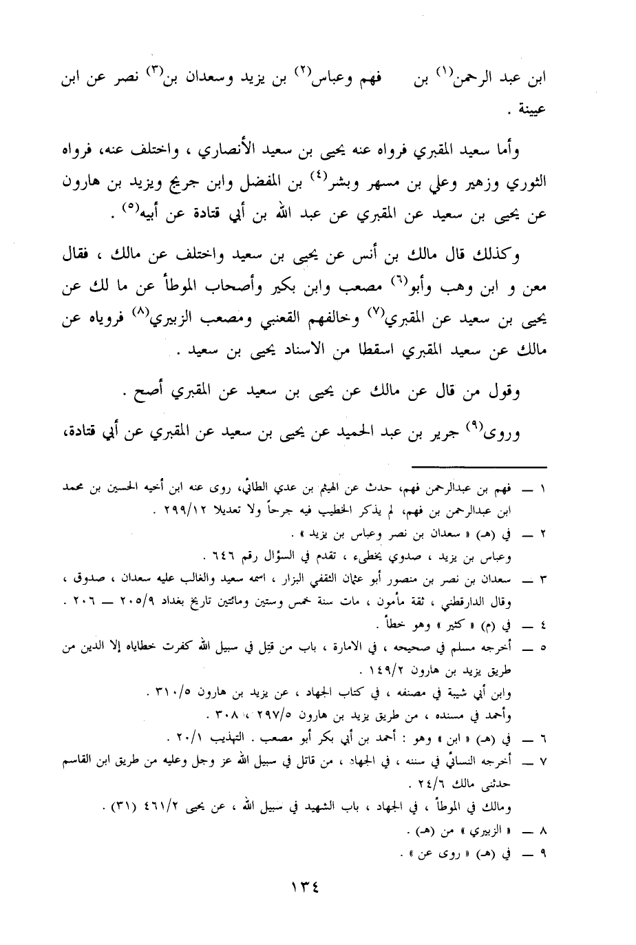 وَاخْتُلِفَ عَنْ مَالِكٍ، فَقَالَ مَعْنٌ، وَابْنُ وَهْبٍ، وَأَبُو مُصْعَبٍ، وَابْنُ بُكَيْرٍ، وَأَصْحَابُ "الْمُوَطَّأِ"، عَنْ مَالِكٍ، عَنْ يَحْيَى بْنِ سَعِيدٍ الْمَقْبُرِيِّ، وَخَالَفَهُمُ الْقَعْنَبِيُّ، وَمُصْعَبٌ الزُّبَيْرِيُّ، فَرَوَيَاهُ عَنْ مَالِكٍ، عَنْ سَعِيدٍ الْمَقْبُرِيِّ، أَسْقَطَا مِنَ الْإِسْنَادِ يَحْيَى بْنِ سَعِيدٍ.