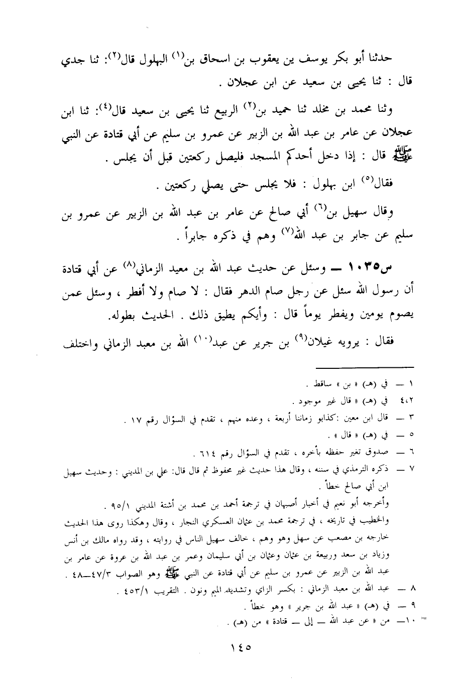 1035- وَسُئِلَ عَنْ حَدِيثِ عَبْدِ اللَّهِ بْنِ مَعْبَدٍ الزِّمَّانِيُّ، عَنْ أَبِي قَتَادَةَ، أَنَّ رَسُولَ اللَّهِ سُئِلَ عَنْ رَجُلٍ صَامَ الدَّهْرَ، فَقَالَ: لَا صَامَ وَلَا أَفْطَرَ، وَسُئِلَ عَمَّنْ يَصُومُ يَوْمَيْنِ، وَيُفْطِرُ يَوْمًا، قَالَ: وَأَيُّكُمْ يُطِيقُ ذَلِكَ، الْحَدِيثَ بِطُولِهِ.