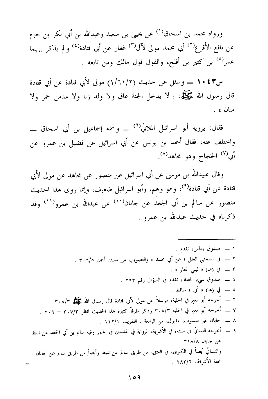 1043- وسئل عن حديث مولى لأبي قَتَادَةَ، عَنْ أَبِي قَتَادَةَ، قَالَ رَسُولُ اللَّهِ صَلَّى اللَّهُ عَلَيْهِ وَسَلَّمَ: لَا يَدْخُلُ الْجَنَّةَ عَاقٌّ، وَلَا وَلَدُ زِنَا، وَلَا مُدْمِنُ خَمْرٍ، وَلَا مَنَّانٌ.