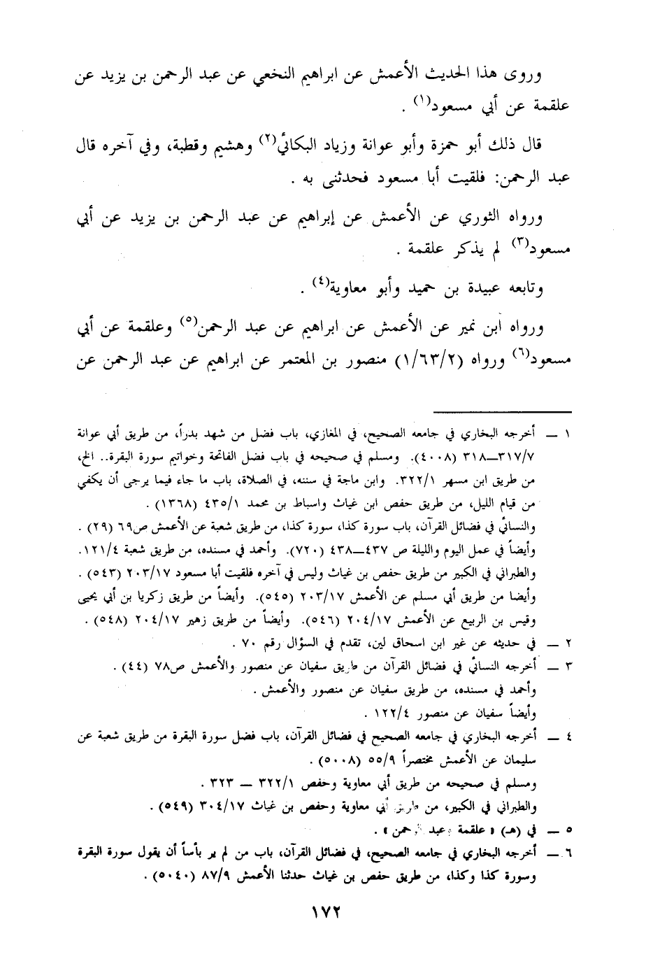 قَالَ ذَلِكَ أَبُو حَمْزَةَ، وَأَبُو عَوَانَةَ، وَزِيَادٌ الْبَكَّائِيُّ، وَهُشَيْمٌ، وَقُطْبَةُ وَفِي آخِرِهِ، قَالَ عَبْدُ الرَّحْمَنِ: فَلَقِيتُ أبَا مَسْعُودٍ، فَحَدَّثَنِي بِهِ.