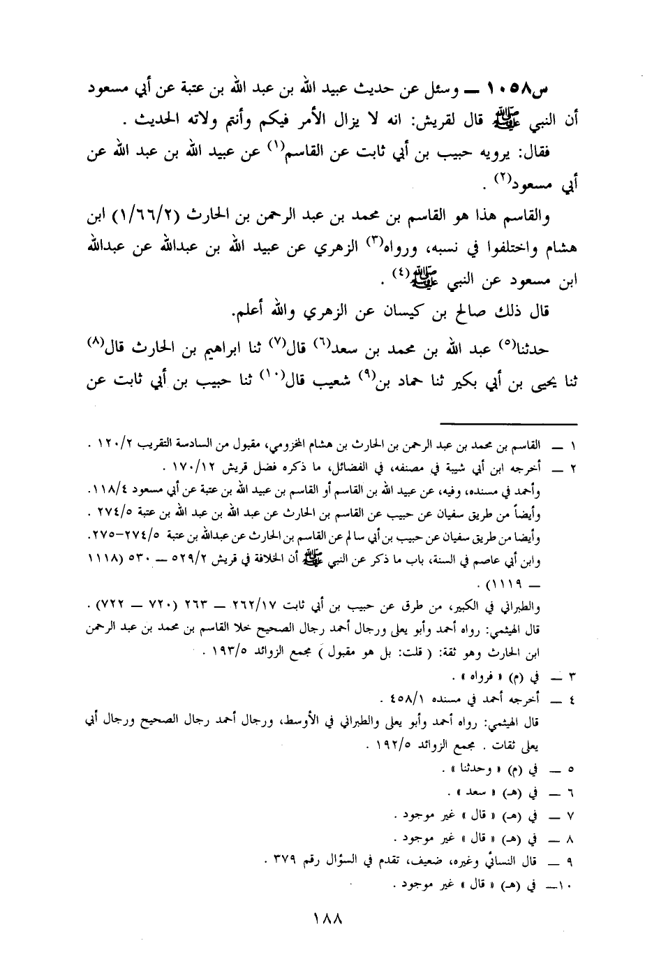1058- وَسُئِلَ عَنْ حَدِيثِ عُبَيْدِ اللَّهِ بْنِ عَبْدِ اللَّهِ بْنِ عُتْبَةَ، عَنْ أَبِي مَسْعُودٍ: أَنَّ النَّبِيَّ صَلَّى اللَّهُ عَلَيْهِ وَسَلَّمَ، قَالَ لِقُرَيْشٍ؛ أَنَّهُ لَا يَزَالُ الْأَمْرُ فِيكُمْ، وَأَنْتُمْ وُلَاتُهُ ... الْحَدِيثَ.