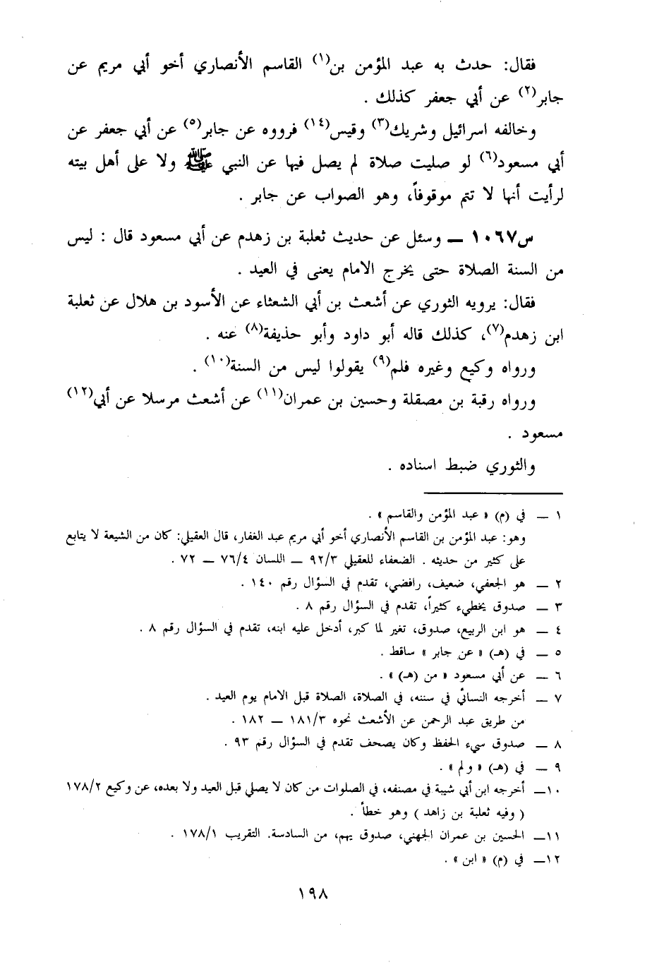 1067- وَسُئِلَ عَنْ حَدِيثِ ثَعْلَبَةَ بْنِ زَهْدَمٍ، عَنْ أَبِي مَسْعُودٍ، قَالَ: لَيْسَ مِنَ السُّنَّةِ الصَّلَاةُ حَتَّى يَخْرُجَ الْإِمَامُ يَعْنِي فِي الْعِيدِ.