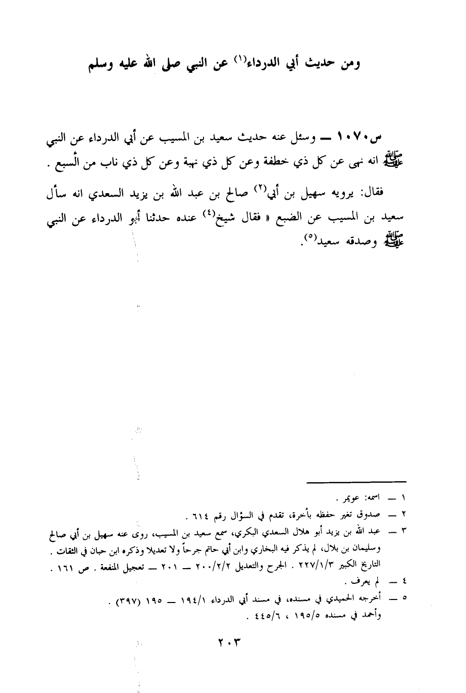 1070- وَسُئِلَ عَنْهُ حَدِيثُ سَعِيدِ بْنِ الْمُسَيِّبِ، عَنْ أَبِي الدَّرْدَاءِ، عَنِ النَّبِيِّ صَلَّى اللَّهُ عَلَيْهِ وَسَلَّمَ؛ أَنَّهُ نَهَى عَنْ كُلِّ ذِي خَطْفَةٍ، وَعَنْ كُلِّ ذِي نُهْبَةٍ، وَعَنْ كُلِّ ذِي نَابٍ مِنَ السَّبْعِ.