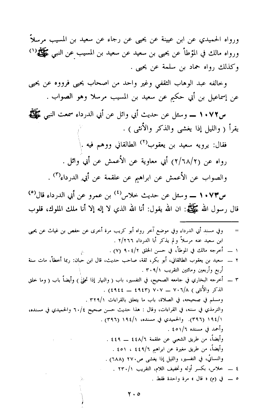 1072- وَسُئِلَ عَنْ حَدِيثِ أَبِي وَائِلٍ، عَنْ أَبِي الدَّرْدَاءِ سَمِعْتُ النَّبِيَّ صَلَّى اللَّهُ عَلَيْهِ وَسَلَّمَ، يَقْرَأُ: (وَاللَّيْلِ إِذَا يَغْشَى، وَالذَّكَرَ وَالأُنْثَى) .