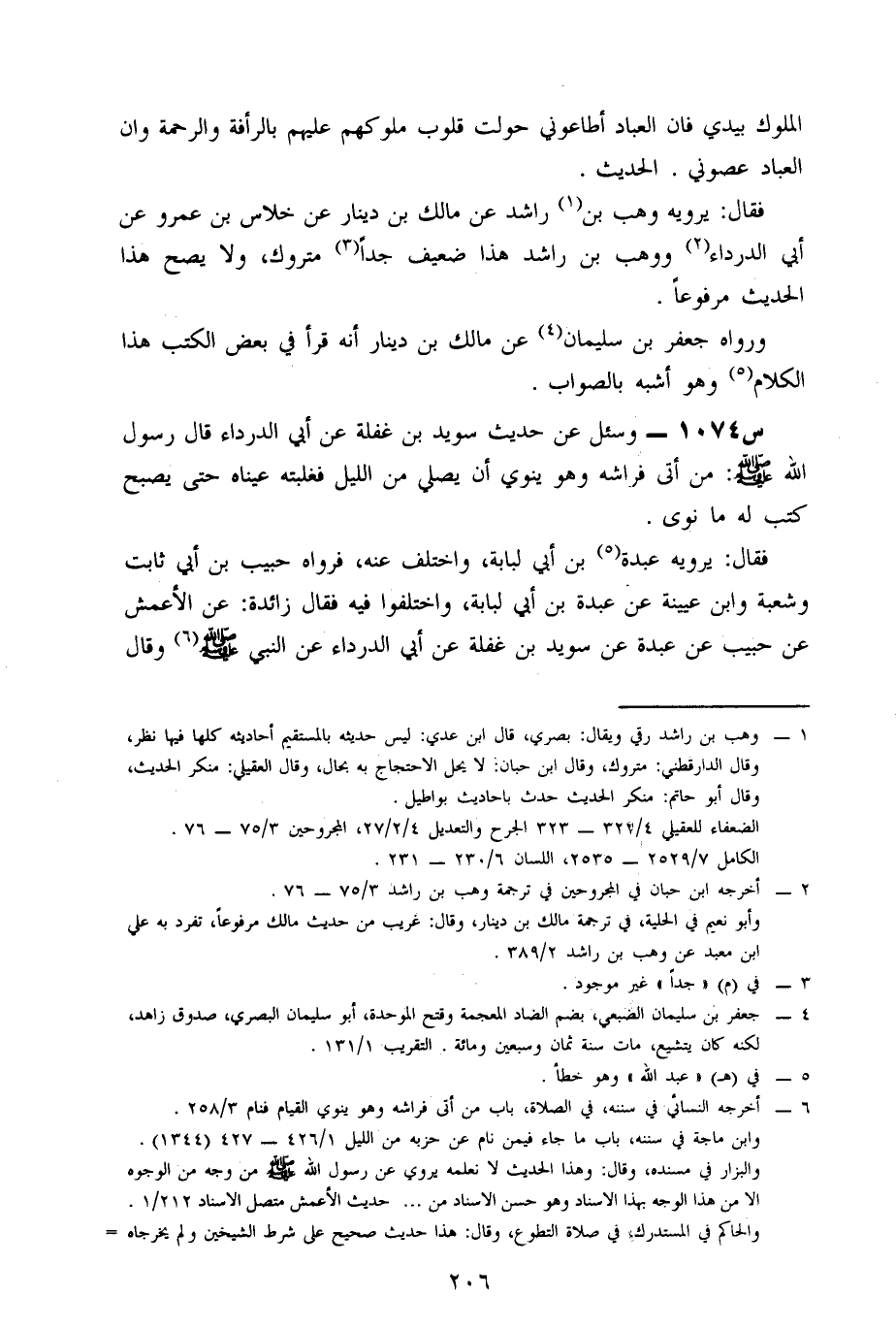 1074- وَسُئِلَ عَنْ حَدِيثِ سُوَيْدِ بْنِ غَفْلَةَ، عَنْ أَبِي الدَّرْدَاءِ، قَالَ رَسُولُ اللَّهِ صَلَّى اللَّهُ عَلَيْهِ وَسَلَّمَ: مَنْ أَتَى فِرَاشَهُ، وَهُوَ يَنْوِي أَنْ يُصَلِّيَ مِنَ اللَّيْلِ، فَغَلَبَتْهُ عَيْنَاهُ حَتَّى يُصْبِحَ كُتِبَ لَهُ مَا نَوَى.
