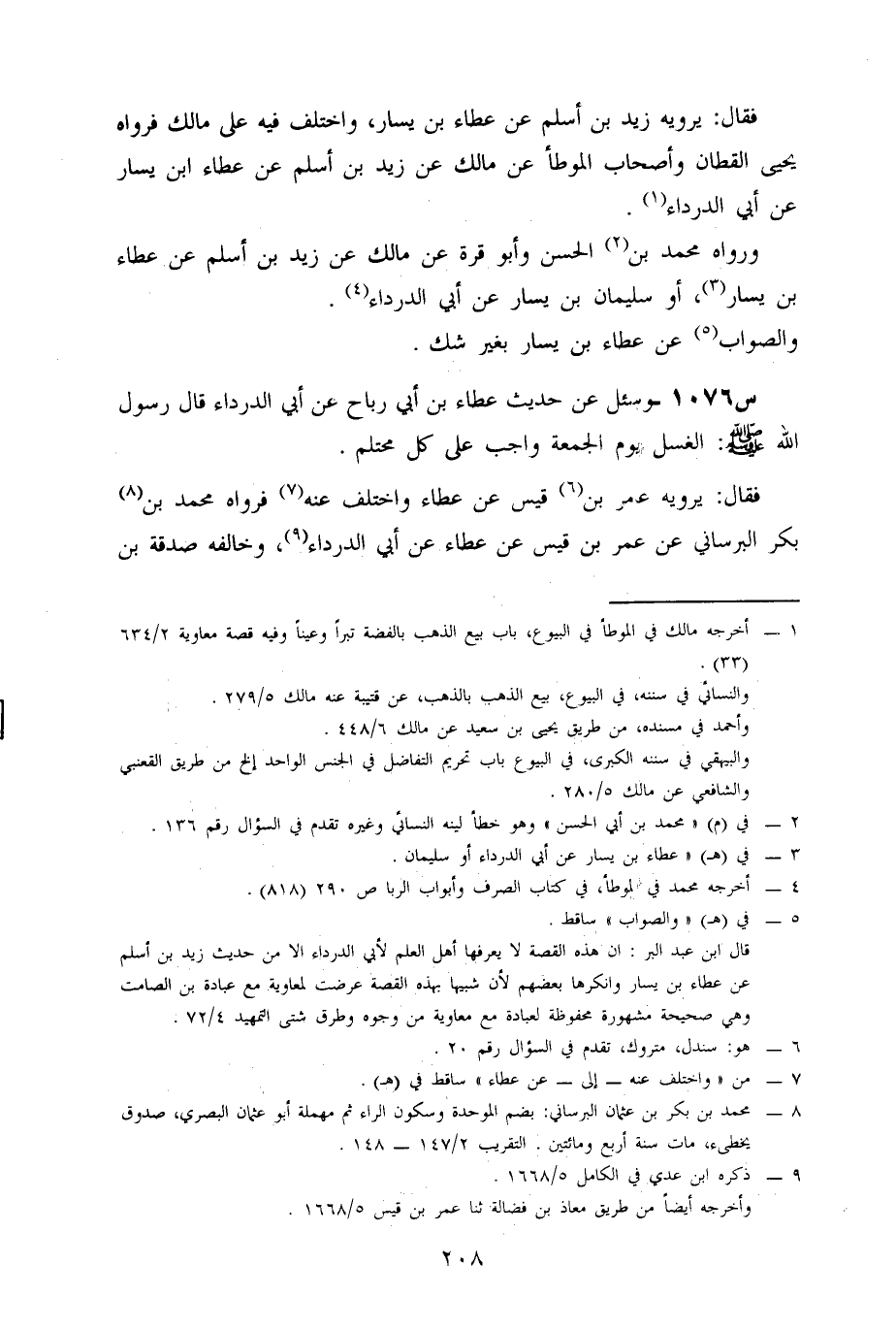 1076- وَسُئِلَ عَنْ حَدِيثِ عَطَاءِ بْنِ أَبِي رَبَاحٍ، عَنْ أَبِي الدَّرْدَاءِ، قَالَ رَسُولُ اللَّهِ صَلَّى اللَّهُ عَلَيْهِ وَسَلَّمَ: الْغُسْلُ يَوْمَ الْجُمُعَةِ وَاجِبٌ عَلَى كُلِّ مُحْتَلِمٍ.