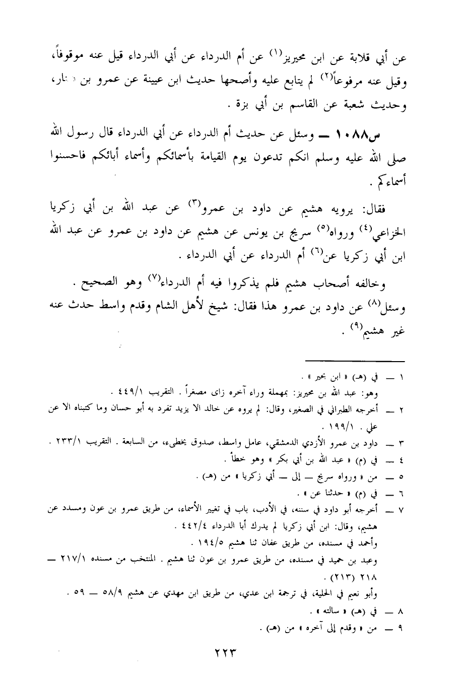 1088- وَسُئِلَ عَنْ حَدِيثِ أُمِّ الدَّرْدَاءِ، عَنْ أَبِي الدَّرْدَاءِ، قَالَ رَسُولُ اللَّهِ صَلَّى اللَّهُ عَلَيْهِ وَسَلَّمَ: إِنَّكُمْ تُدْعَوْنَ يَوْمَ الْقِيَامَةِ بِأَسْمَائِكُمْ وَأَسْمَاءِ آبَائِكُمْ، فَأَحْسِنُوا أَسْمَاءَكُمْ.
