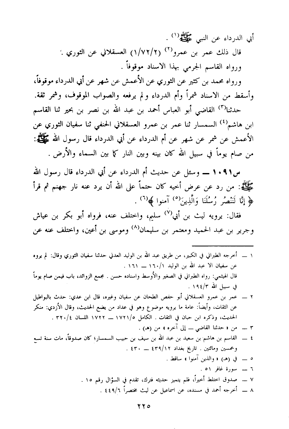 1091- وَسُئِلَ عَنْ حَدِيثِ أُمِّ الدَّرْدَاءِ، عَنْ أَبِي الدَّرْدَاءِ، قَالَ رَسُولُ اللَّهِ صَلَّى اللَّهُ عَلَيْهِ وَسَلَّمَ: مَنْ رَدَّ عَنْ عِرْضِ أَخِيهِ كَانَ حَتْمًا عَلَى اللَّهِ أَنْ يَرُدَّ عَنْهُ نَارَ جَهَنَّمَ، ثُمَّ قَرَأَ: {إِنَّا لَنَنْصُرُ رُسُلَنَا وَالَّذِينَ آمنوا} .