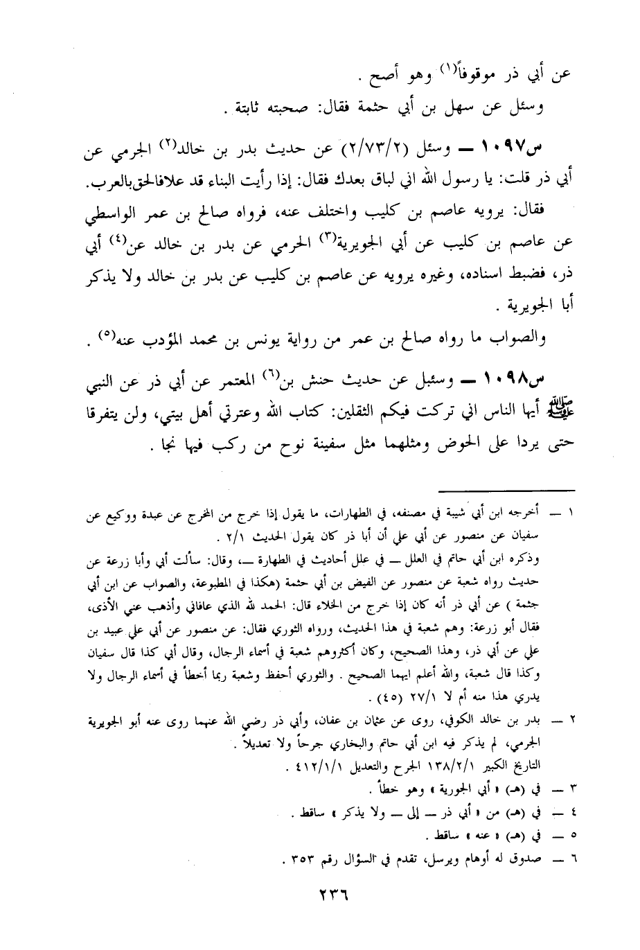 1098- وَسُئِلَ عَنْ حَدِيثِ حَنَشِ بْنِ الْمُعْتَمِرِ، عَنْ أَبِي ذَرٍّ، عَنِ النَّبِيِّ صَلَّى اللَّهُ عَلَيْهِ وَسَلَّمَ: أَيُّهَا النَّاسُ، أَنِّي تَرَكْتُ فِيكُمُ الثَّقَلَيْنِ: كِتَابَ اللَّهِ وَعِتْرَتِي أَهْلُ بَيْتِي، وَلَنْ يَتَفَرَّقَا حَتَّى يَرِدَا عَلَيَّ الْحَوْضَ، وَمِثْلُهُمَا مِثْلُ سَفِينَةِ نُوحٍ، مَنْ رَكِبَ فِيهَا نَجَا.