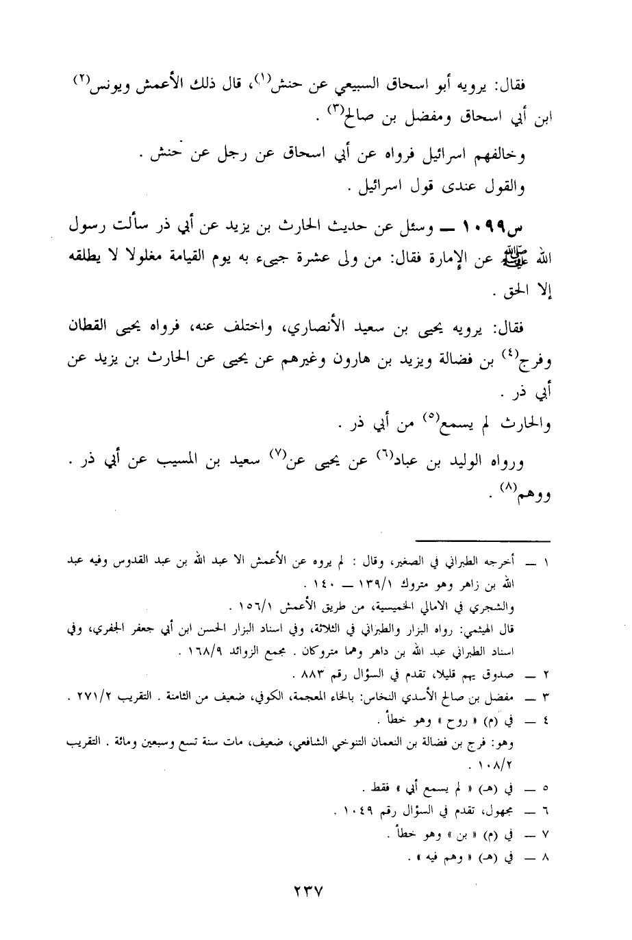 1099- وَسُئِلَ عَنْ حَدِيثِ الْحَارِثِ بْنِ يَزِيدَ، عَنْ أَبِي ذَرٍّ، سَأَلْتُ رَسُولَ اللَّهِ صَلَّى اللَّهُ عَلَيْهِ وَسَلَّمَ عَنِ الْإِمَارَةِ، فَقَالَ: مَنْ وَلِيَ عَشْرَةً جِيءَ بِهِ يَوْمَ الْقِيَامَةِ مَغْلُولًا، لَا يُطْلِقُهُ إِلَّا الْحَقُّ.