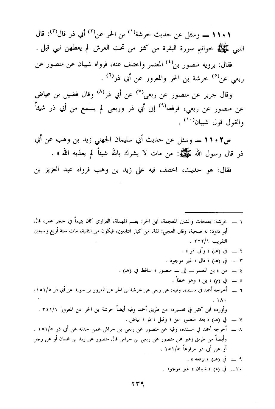 فَقَالَ: هُوَ حَدِيثٌ اخْتُلِفَ فِيهِ عَلَى زَيْدِ بْنِ وَهْبٍ، فَرَوَاهُ عَبْدُ الْعَزِيزِ بْنُ رَفِيعٍ، وَحَبِيبُ بْنُ أَبِي ثَابِتٍ، وَسُلَيْمَانُ الْأَعْمَشُ، وَغَيْرُهُ، عَنْ زَيْدِ بْنِ وَهْبٍ، عَنْ أَبِي ذَرٍّ.