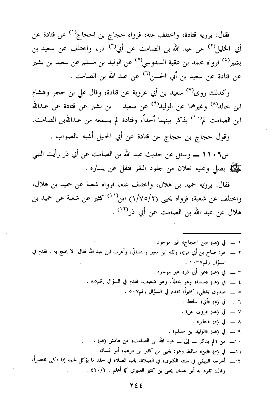 1106- وَسُئِلَ عَنْ حَدِيثِ عَبْدِ اللَّهِ بْنِ الصَّامِتِ، عَنْ أَبِي ذَرٍّ رَأَيْتُ النَّبِيَّ صَلَّى اللَّهُ عَلَيْهِ وَسَلَّمَ يُصَلِّي، وَعَلَيْهُ نَعْلَانِ مِنْ جُلُودِ الْبَقَرِ، فَتَفَلَ عَنْ يَسَارِهِ.