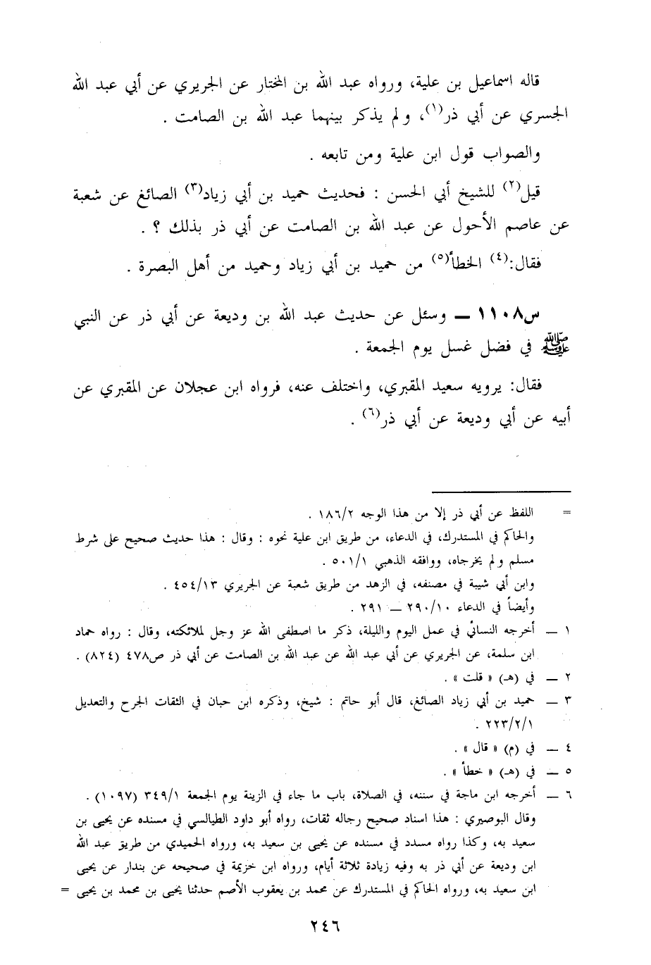 1108- وَسُئِلَ عَنْ حَدِيثِ عَبْدِ اللَّهِ بْنِ وَدِيعَةَ، عَنْ أَبِي ذَرٍّ، عَنِ النَّبِيِّ صَلَّى اللَّهُ عَلَيْهِ وَسَلَّمَ فِي فَضْلِ غُسْلِ يَوْمِ الْجُمُعَةِ.