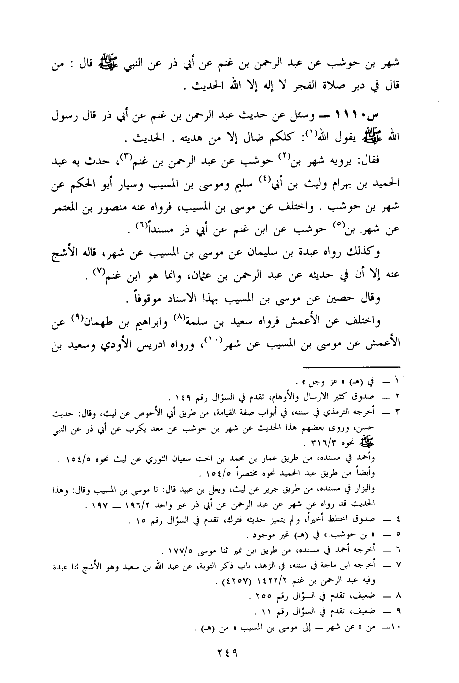 1110- وَسُئِلَ عَنْ حَدِيثِ عَبْدِ الرَّحْمَنِ بْنِ غُنْمٍ، عَنْ أَبِي ذَرٍّ، قَالَ رَسُولُ اللَّهِ صَلَّى اللَّهُ عَلَيْهِ وَسَلَّمَ: يَقُولُ اللَّهُ: كُلُّكُمْ ضَالٌّ إِلَّا مَنْ هَدَيْتُهُ ... الْحَدِيثَ.