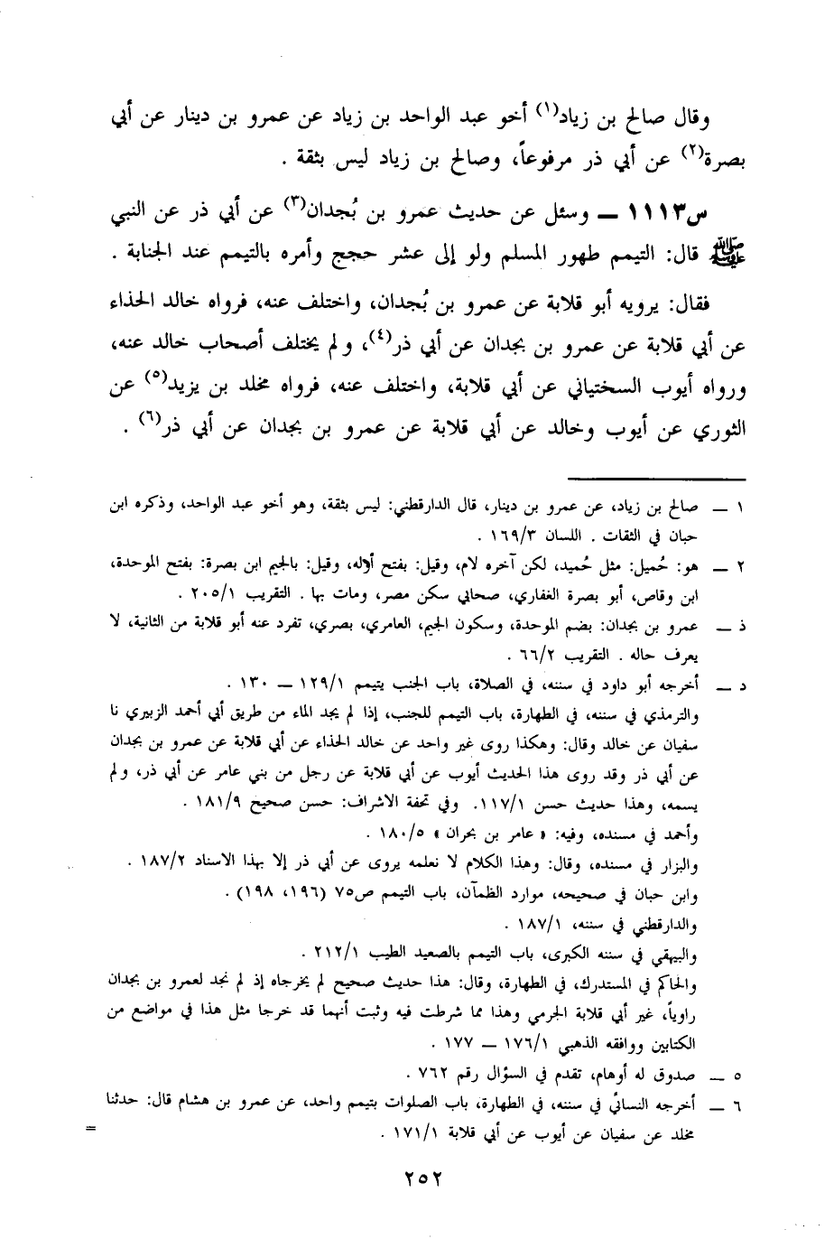 1113- وَسُئِلَ عَنْ حَدِيثِ عَمْرِو بْنِ بُجْدَانَ، عَنْ أَبِي ذَرٍّ، عَنِ النَّبِيِّ صَلَّى اللَّهُ عَلَيْهِ وَسَلَّمَ، قَالَ: التَّيَمُّمُ طَهُورُ الْمُسْلِمِ، وَلَوْ إِلَى عَشْرِ حِجَجٍ، وَأَمَرَهُ بِالتَّيَمُّمِ عِنْدَ الْجَنَابَةِ.