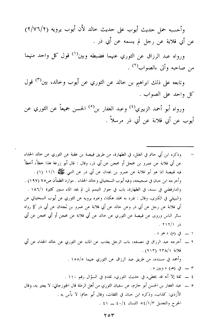 وَرَوَاهُ أَبُو أَحْمَدَ الزُّبَيْرِيُّ، وَعَبْدُ الْغَفَّارِ بْنُ الْحَسَنِ جَمِيعًا، عَنِ الثَّوْرِيِّ، عَنْ أَيُّوبَ، عَنْ أَبِي قِلَابَةَ، عَنْ أَبِي ذَرٍّ مُرْسَلًا.
