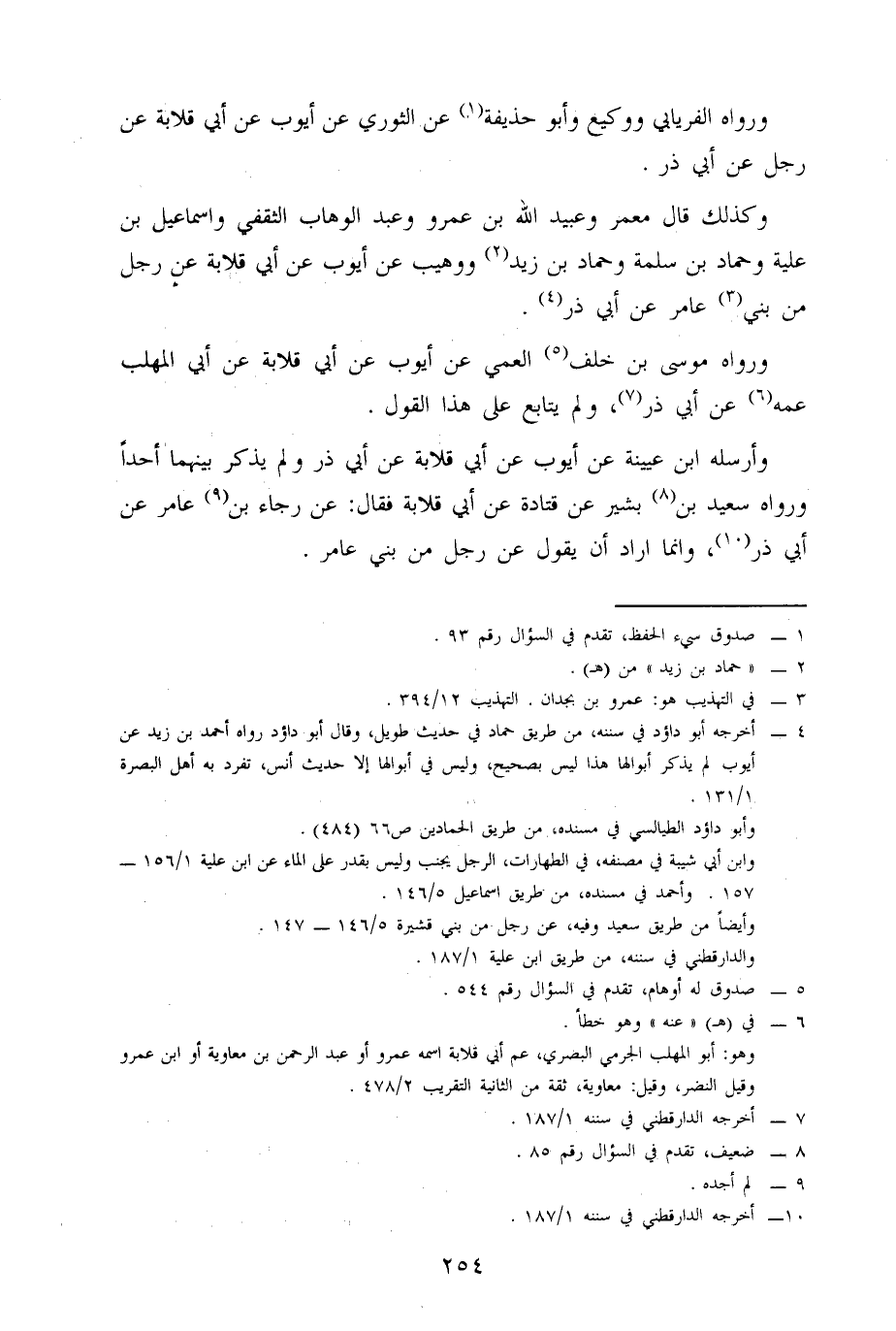 وَكَذَلِكَ قَالَ مَعْمَرٌ، وَعُبَيْدُ اللَّهِ بْنُ عَمْرٍو، وعبد الوهاب الثقفي، وإسماعيل بن عُلَيَّةَ، وَحَمَّادُ بْنُ سَلَمَةَ، وَحَمَّادُ بْنُ زَيْدٍ، وَوُهَيْبٌ: عَنْ أَيُّوبَ، عَنْ أَبِي قِلَابَةَ، عَنْ رَجُلٍ مِنْ بَنِي عَامِرٍ، عَنْ أَبِي ذَرٍّ.