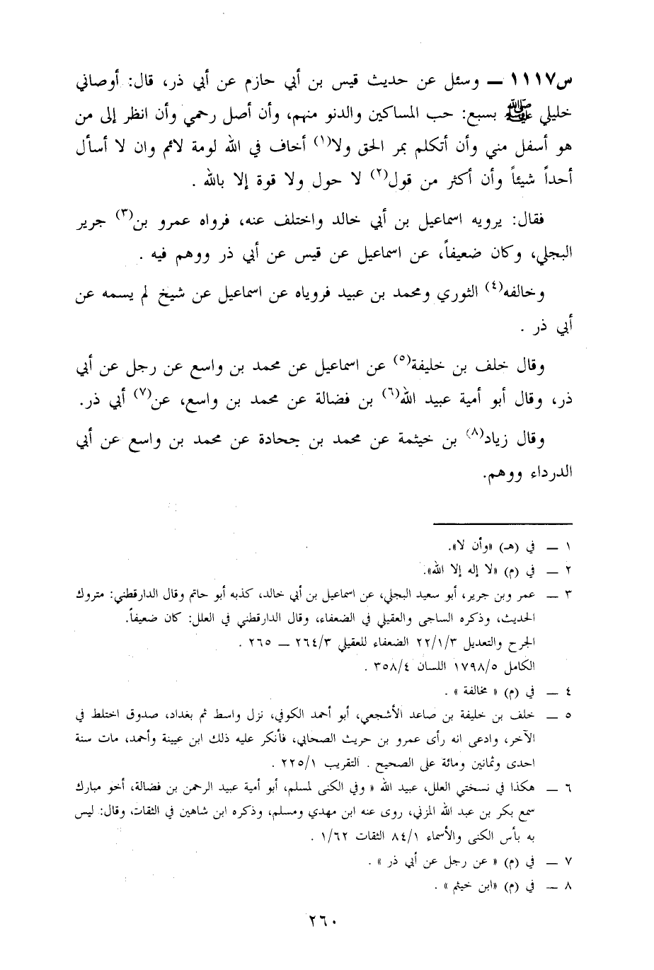 1117- وَسُئِلَ عَنْ حَدِيثِ قَيْسِ بْنِ أَبِي حَازِمٍ، عَنْ أَبِي ذَرٍّ، قَالَ: أَوْصَانِي خَلِيلِي صَلَّى اللَّهُ عَلَيْهِ وَسَلَّمَ بِسَبْعٍ: حُبُّ الْمَسَاكِينِ وَالدُّنُوُّ مِنْهُمْ، وَأَنْ أَصِلَ رَحِمِي، وَأَنْ أَنْظُرَ إِلَى مَنْ هُوَ أَسْفَلُ مِنِّي، وَأَنْ أَتَكَلَّمَ بِمُرِّ الْحَقِّ، وَلَا أَخَافَ فِي اللَّهِ لَوْمَةَ لَائِمٍ، وَأَنْ لَا أَسْأَلَ أَحَدًا شَيْئًا، وَأَنْ أُكْثِرَ مِنْ قَوْلِ: لَا حَوْلَ وَلَا قُوَّةَ إِلَّا بِاللَّهِ.