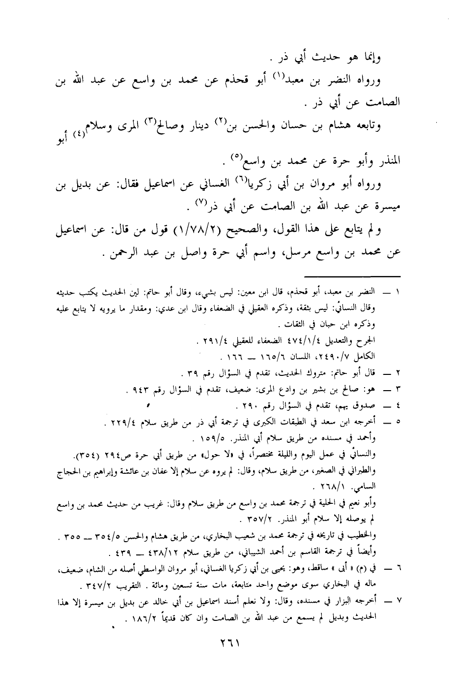 وَرَوَاهُ النَّضْرُ بْنُ مَعْبَدٍ أَبُو قَحْذَمٍ، عَنْ مُحَمَّدِ بْنِ وَاسِعٍ، عَنْ عَبْدِ اللَّهِ بْنِ الصَّامِتِ، عَنْ أَبِي ذَرٍّ.